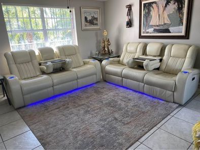 In mint condition has usb for smart device charging, blue under-lighting, cup holders , center counsel on the love seat. Serious offers only.