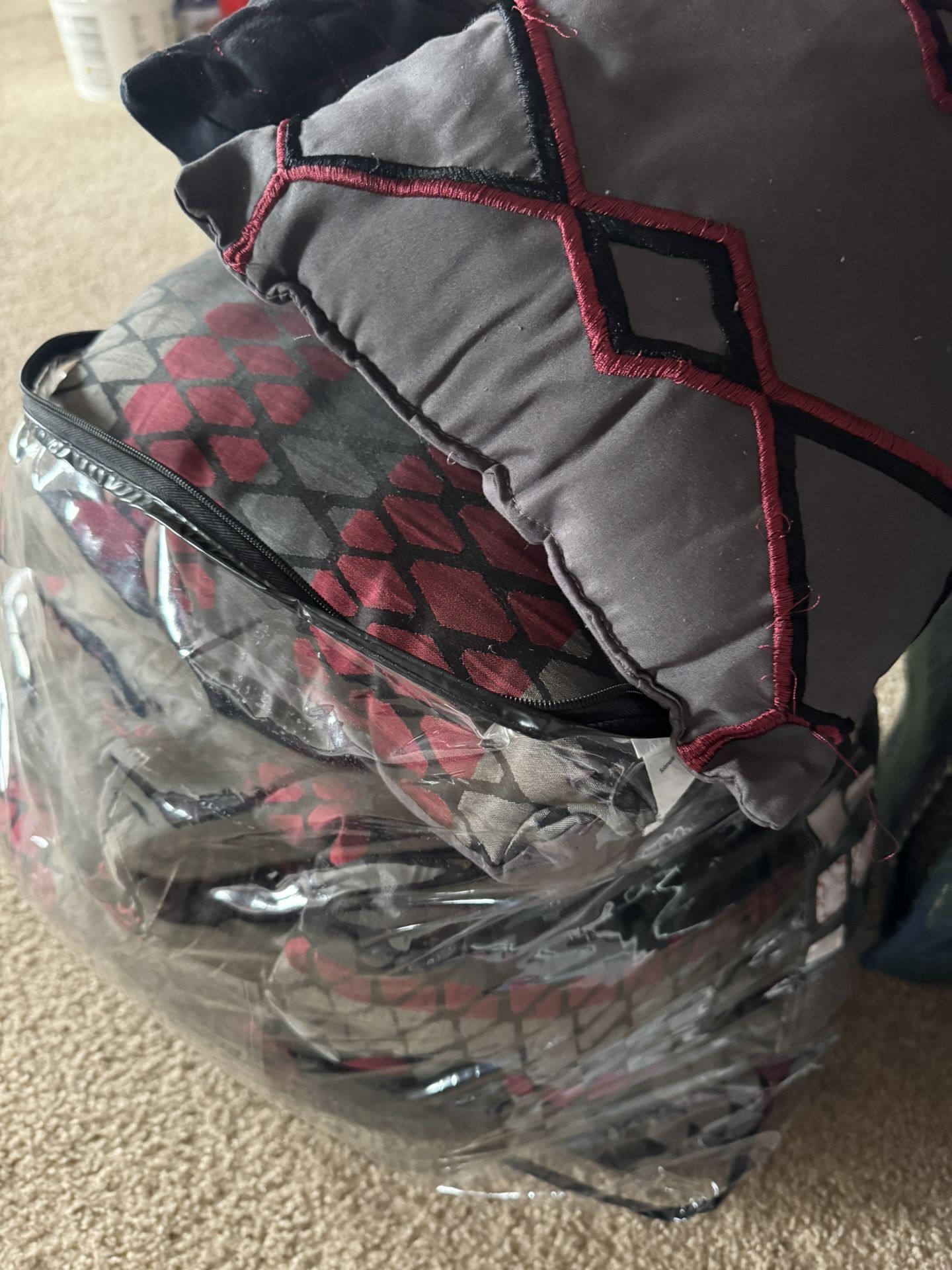 Comforter, fitted sheet, flat sheet, 4 pillowcases, 3 throw pillows.