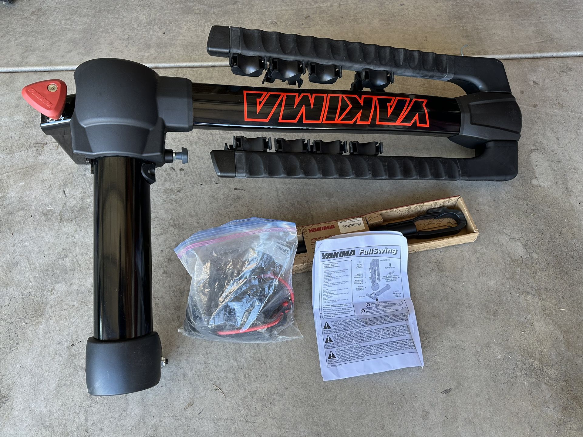 A 4-bike hitch carrier with integrated locks for security, the Yakima FullSwing 4-bike hitch rack also pivots to the side of your vehicle for instant rear access. Was an amazing roadtrip accessory for our Odyssey minivan. Works with any vehicle with a tow hitch. We are also including the top tube adjuster. More details available at https://offerup.com/redirect/?o=aHR0cHM6Ly93d3cucmVpLmNvbS9wcm9kdWN0Lzg1NDc4MS95YWtpbWEtZnVsbHN3aW5nLTQtYmlrZS1oaXRjaC1yYWNr