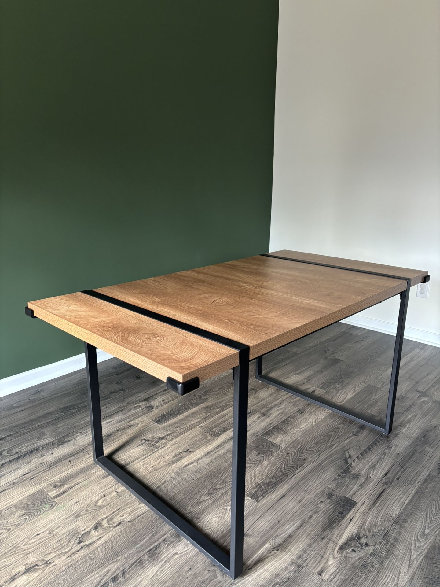 A beautiful manufactured wood top showcases the warm wood grain and natural imperfection, while metal legs with sanded MATT black finish creates a MODERN and NATURAL focal point in any dining room or kitchen. The 1.6" thickness faux-wood top is an EASE to CLEAN and BREEZE to MAINTAIN, the metal leg is heavy duty and sturdy. Complete the look with other pieces from this collection,besides this dining table, we got a full list of counter table,dining set, TV stand, and a coffee table. 1.6 in. thickness faux-wood top is an ease to clean and breeze to maintain 4 ANTI-SCRATCH FELT cap to proect your floor. Long-lasting solid metal base is sturdy and durable. Industry and loft design A beautiful manufactured wood top The high-grade manufactured wood is laminated with the gorgeous faux-wood foil, this finish give this table natural warmth and texture