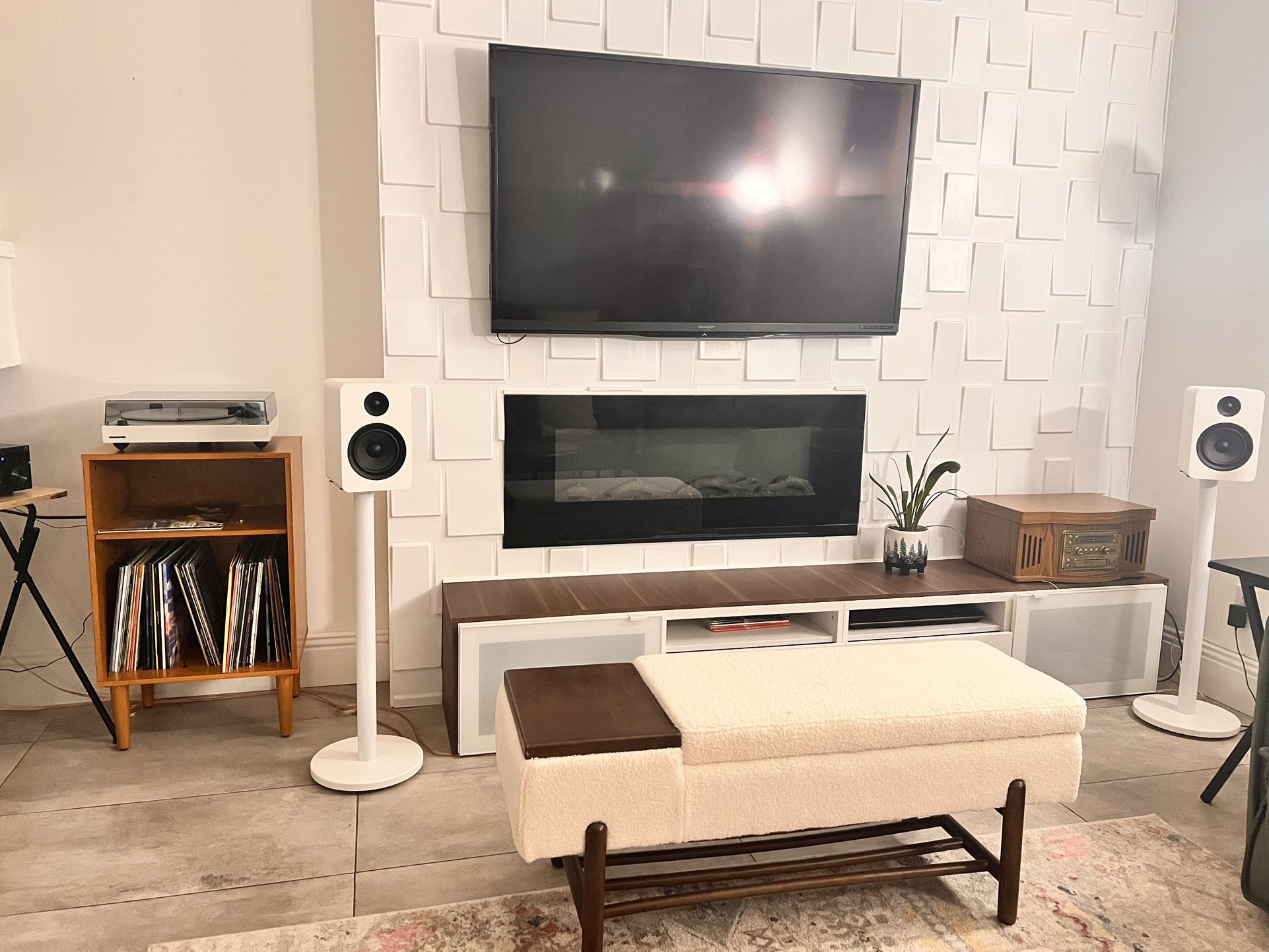 Originally $156 on Amazon. Search “Modern Entryway Storage Bench, Upholstered Shoe Ottoman Bench, Sherpa Flip-Top End of Bed Bench with Wood Shelf/Coffee Table for Living Room/Bedroom/Hallway/Under Window,46.5 Inches,Beige Fur”
