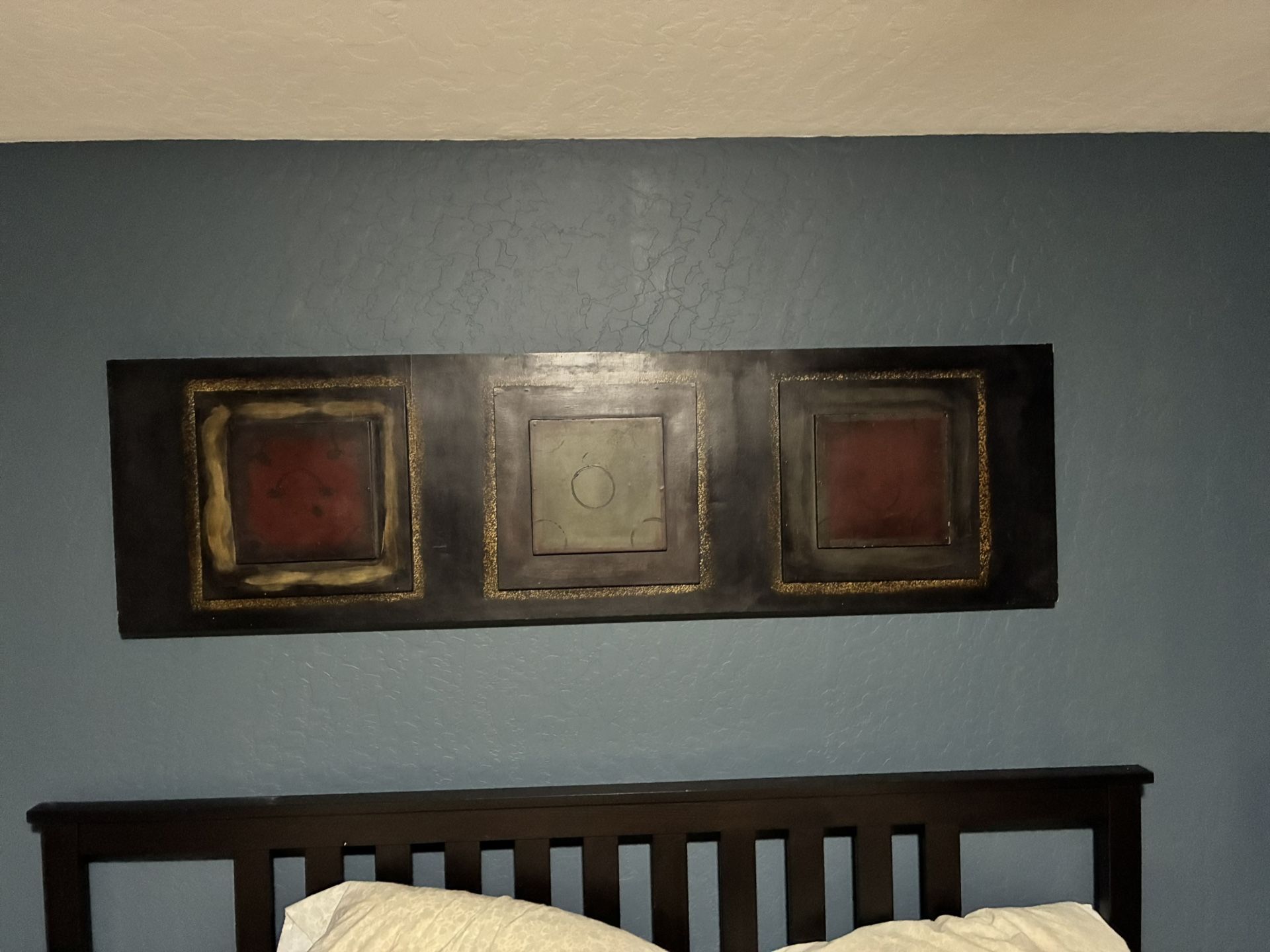 Large Wood Wall Art – Modern Abstract Panel – 70” x 19.75” – $40 Beautiful oversized wood wall art panel with three raised abstract square designs. Modern look with warm reds, gold accents, and a dark frame. It’s surprisingly lightweight for its size, so it’s easy to hang. Great for a bedroom, living room, hallway, or office. Excellent condition. Smoke-free home. Dimensions: 70” wide × 19 3/4” tall Pickup in Mesa.