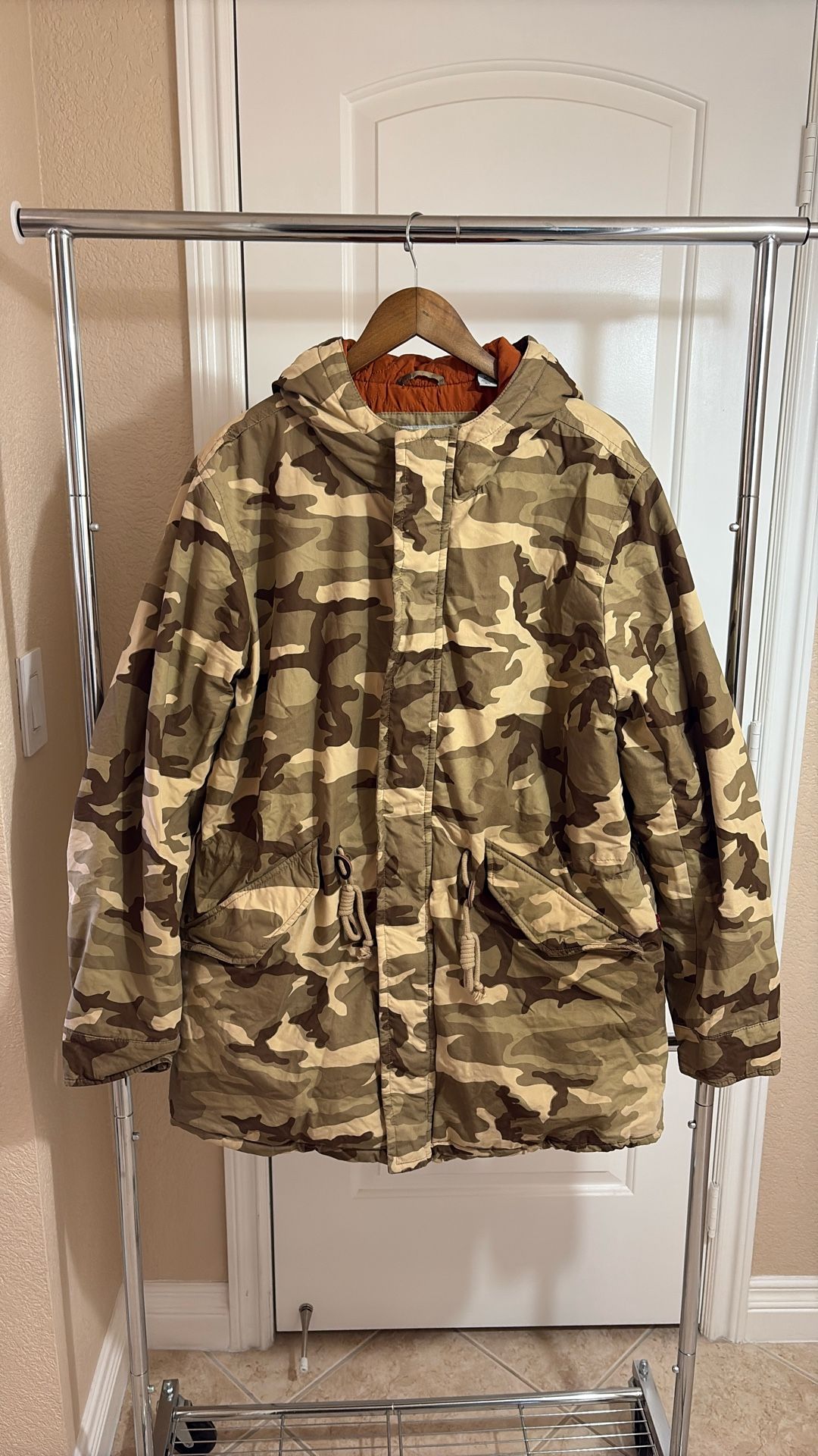 Flamingo and Cimorron Great condition! Camo outside, bright orange quilted lining inside. Warm, stylish, and clean — no damage or stains. Length from shoulder: 34 inches. Three pockets – two outside and one inside. Perfect for fall or winter.