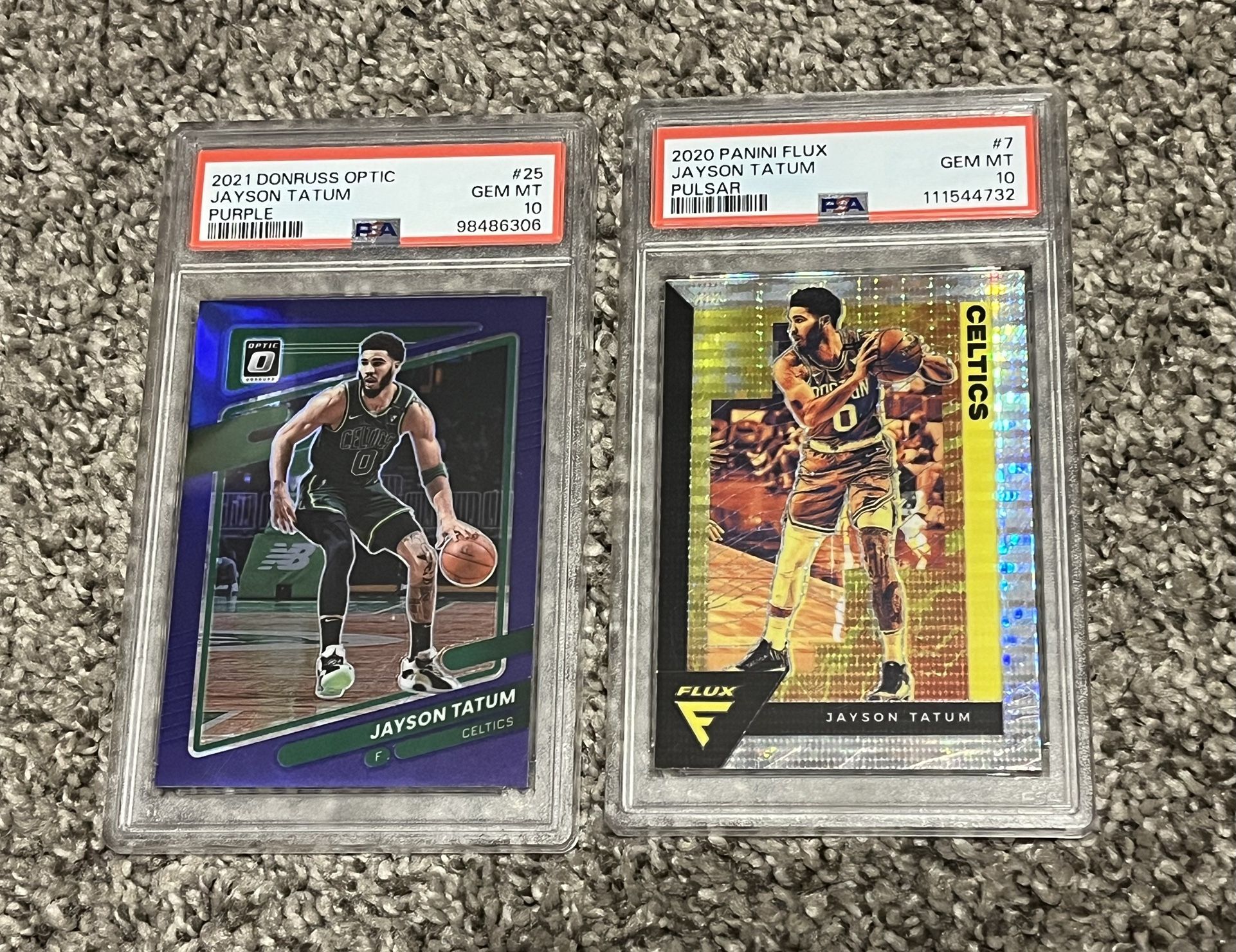 2 Jayson Tatum Parallel PSA gem mint 10 basketball cards. Includes 2020 Panini Flux Pulsar Gold & 2021 Donruss Optic purple parallel. Shipping available upon request.