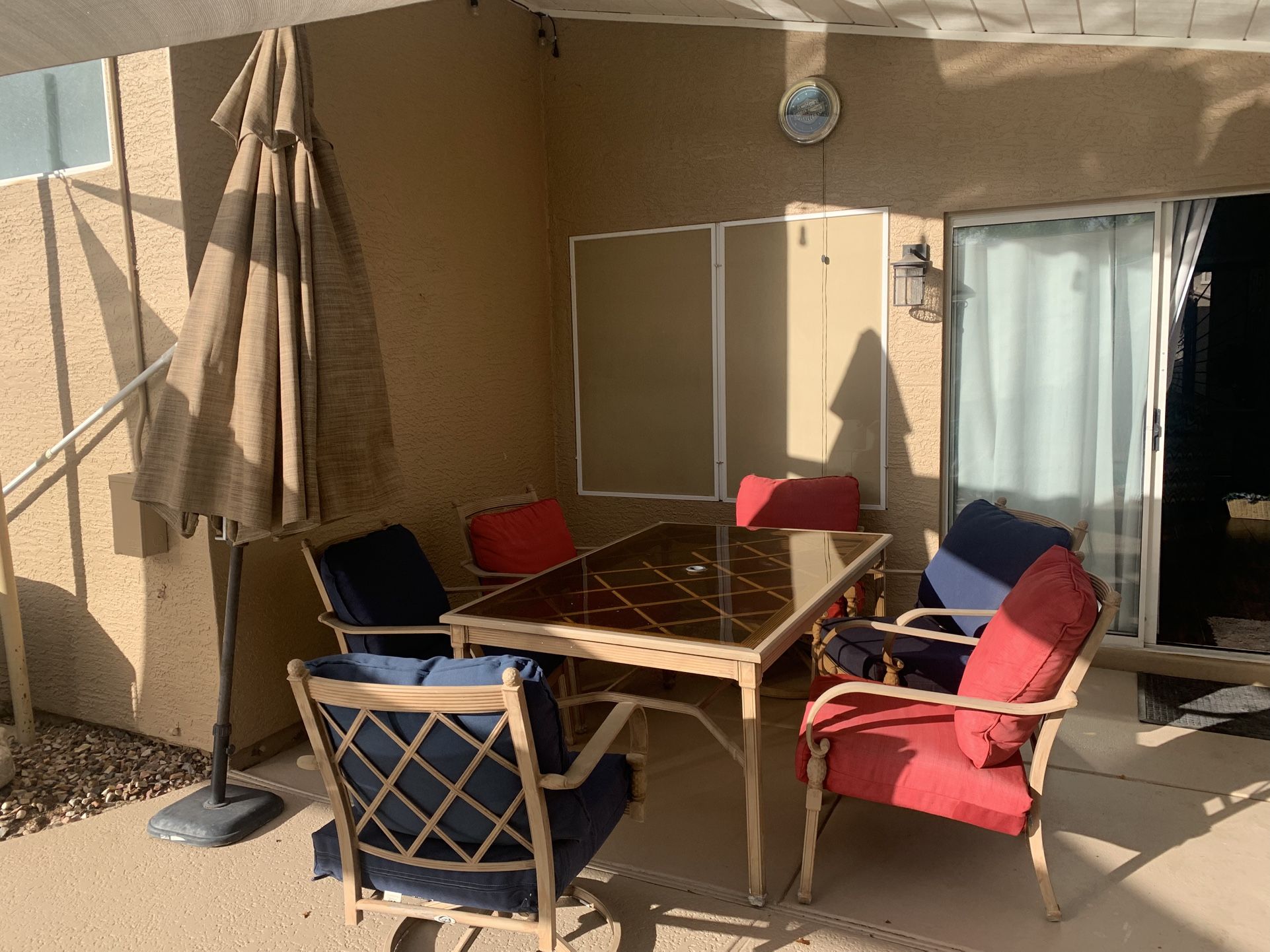 Glass table and 6 chairs, with large Umbrella. $450or BO