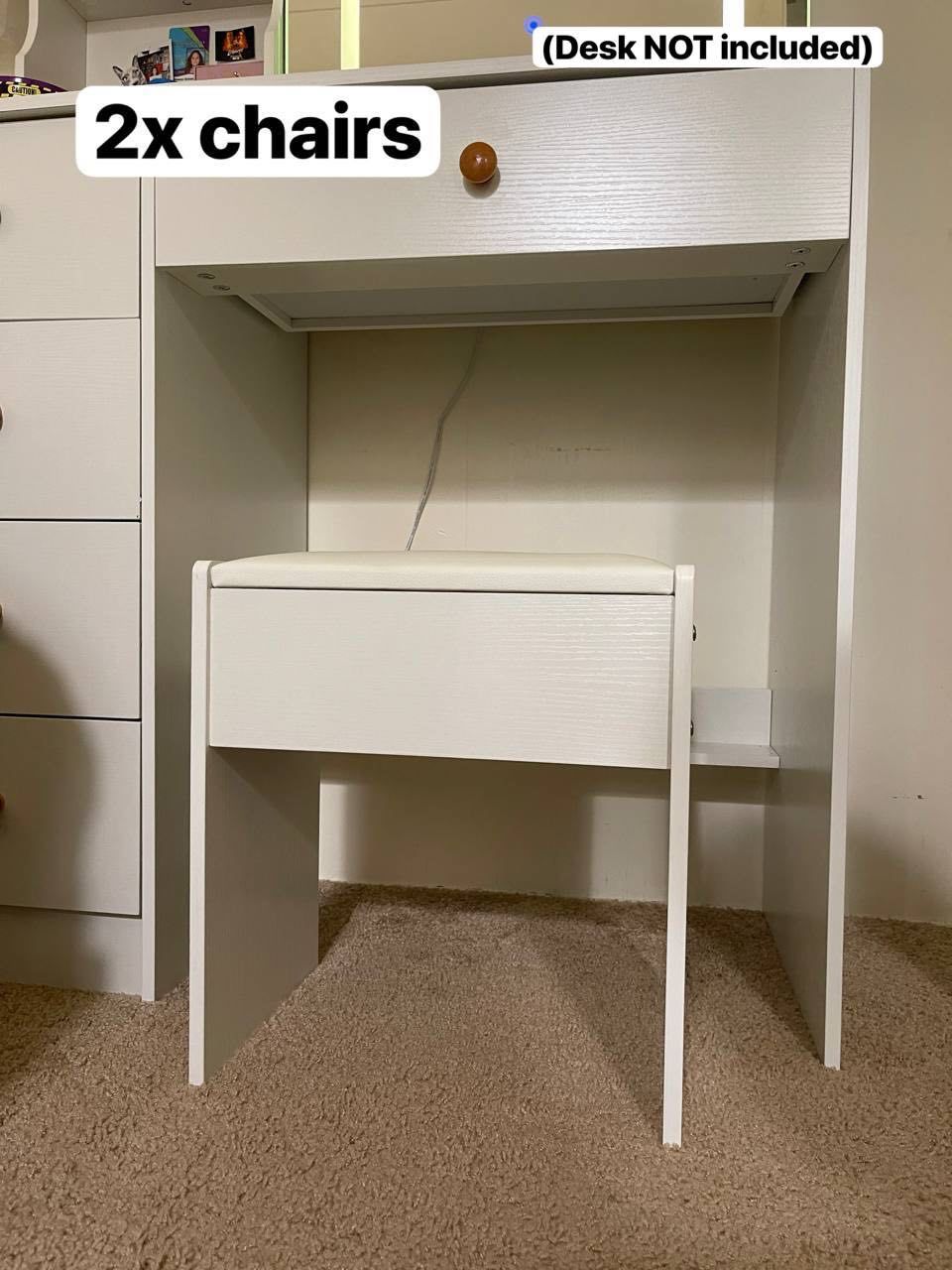 Two identical white chairs in new condition. Perfect for a vanity, makeup table, kids desk, or small workspace. Sturdy, compact, and clean. Approx. size: • Seat height: 16.4” • Width: 15.1” • Depth: 10.2” 30$ per set