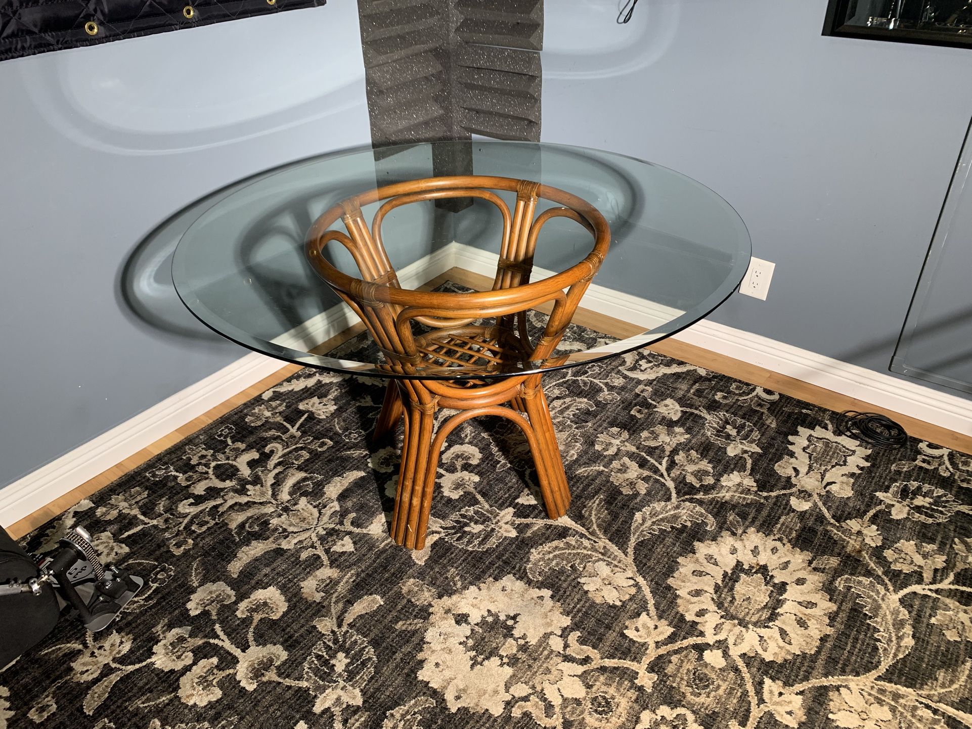 Tommy Bahama 4 foot diameter glass table with Decorative wood stand ( no chairs). Has some scratches on stand, but otherwise in good condition.