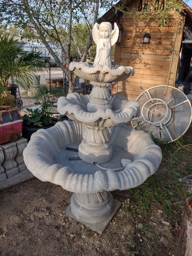 Made of cement, measures about 5 feet tall. Italian dishes sit on Catawba pedestals. Various finials to choose from. Waterfall sounds nice near a patio or garden area. Delivery available Tel(210)37 1-5357....., pools, ponds, statuary, concrete art, birdbaths, pottery, vases, landscaping, lighting, tables, benches, appliances, decor, patio, pavers, river rock, flagstone, cement, stone, st francis, mary, guadalupe tables benches, patio furniture, arcadia, campaña, cottage, international,faith, family,remembrance