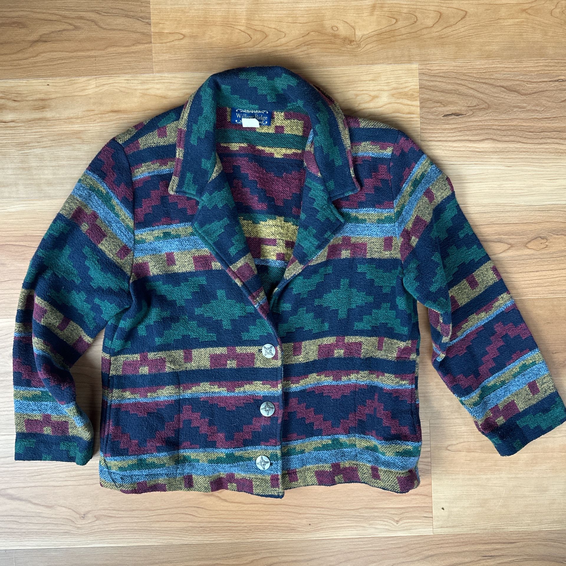 Willow Ridge vintage 90s multi-coloured wool cardigan. Cozy and warm with a retro oversized fit. Features bold colors and classic knit patterning that give off major Pendleton vibes. Perfect for fall layering or winter styling—boho, retro, and uniquely American vintage. #fall #american #pendletonvibes #winter #vintage multicolored wool, 90s cardigan, vintage sweater, fall knitwear, american style, pendleton inspired, winter layers, boho vibe, oversized fit, retro wool cardigan