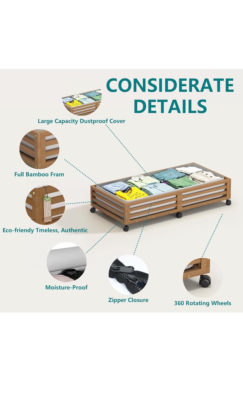 Bamboo Under Bed Storage Containers- Underbed Organizer with Wheels with Large Capacity Dust Bag,Sturdy Wood Rolling Under Bed Shoe Storage Organizer
