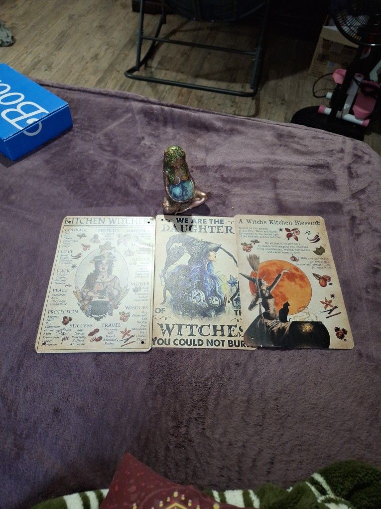 3 witchy tin signs and a Mother Earth statue. Some dings on tin. Not major though. You can see in the pics.
