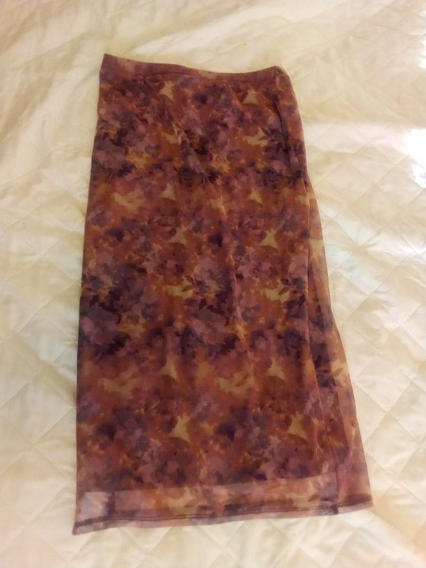 This skirt is a brown floral look it features and inside slip that is connected inside of it. this skirt is made of 93% polyester the shell itself 7% spandex in the lining is 100% polyester.