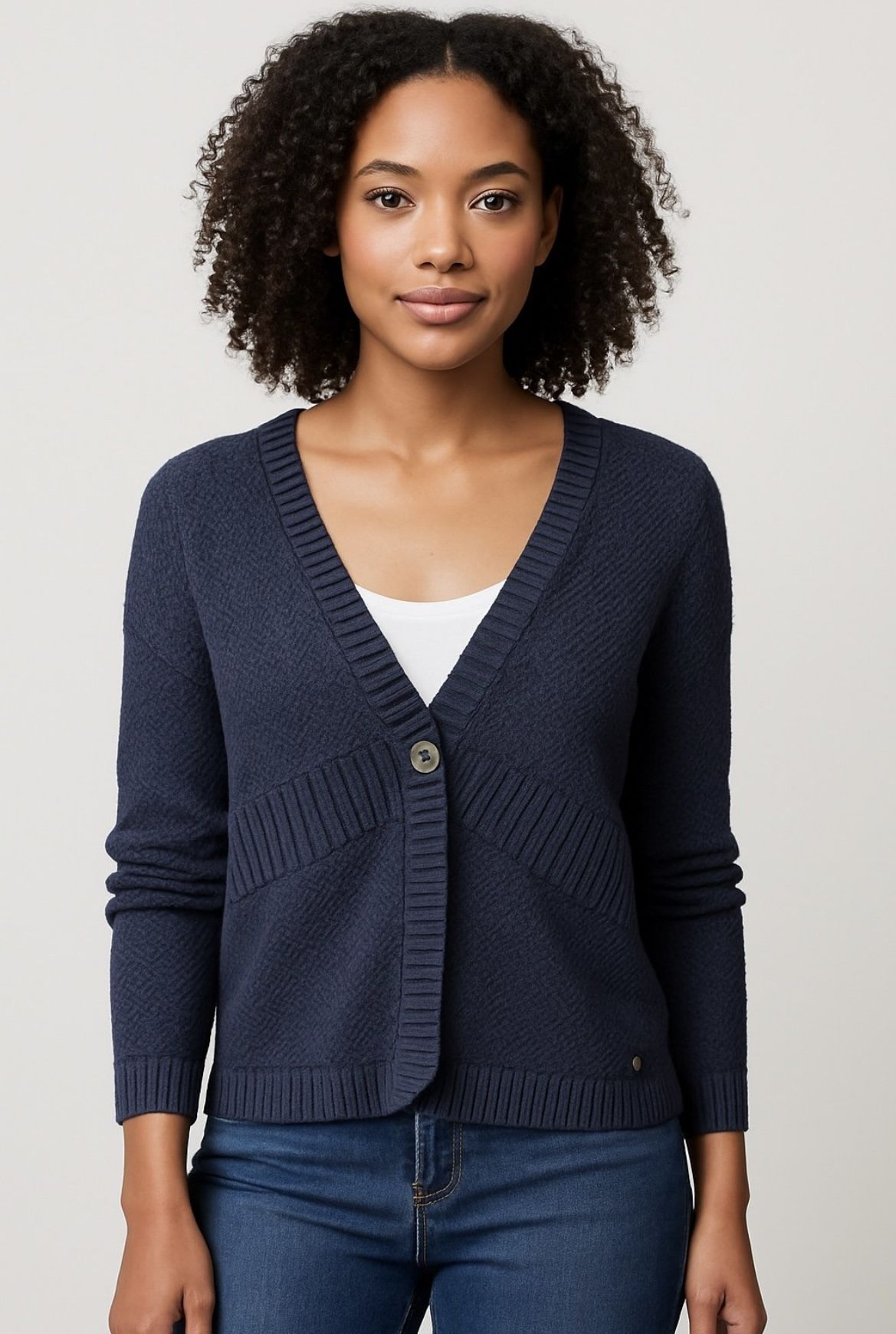 Eddie Bauer women’s XS navy knit cardigan. 100% cotton, textured detailing, one-button front, and perfect for layering. Great condition and ships fast! Measurements: • Length: 24.5 in