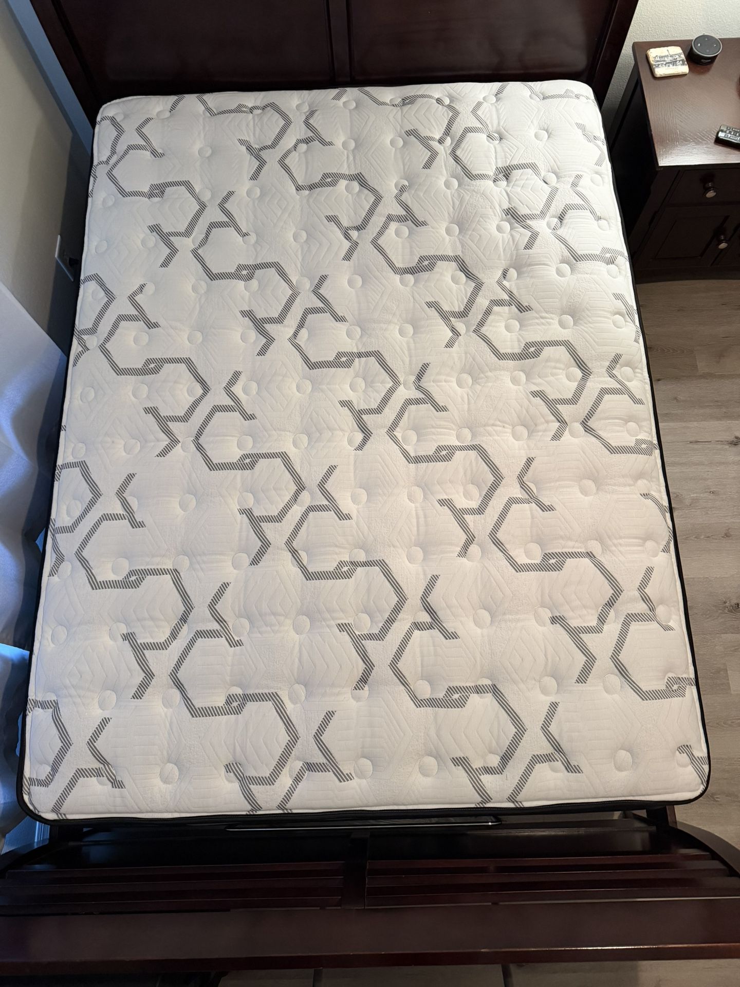 Revive hybrid quern size mattress. It is a “gel spring” mattress which combines traditional coils with gel-infused memory foam. This mattress was only used as a guest room and has only been slept on about 45 times. In very good condition.