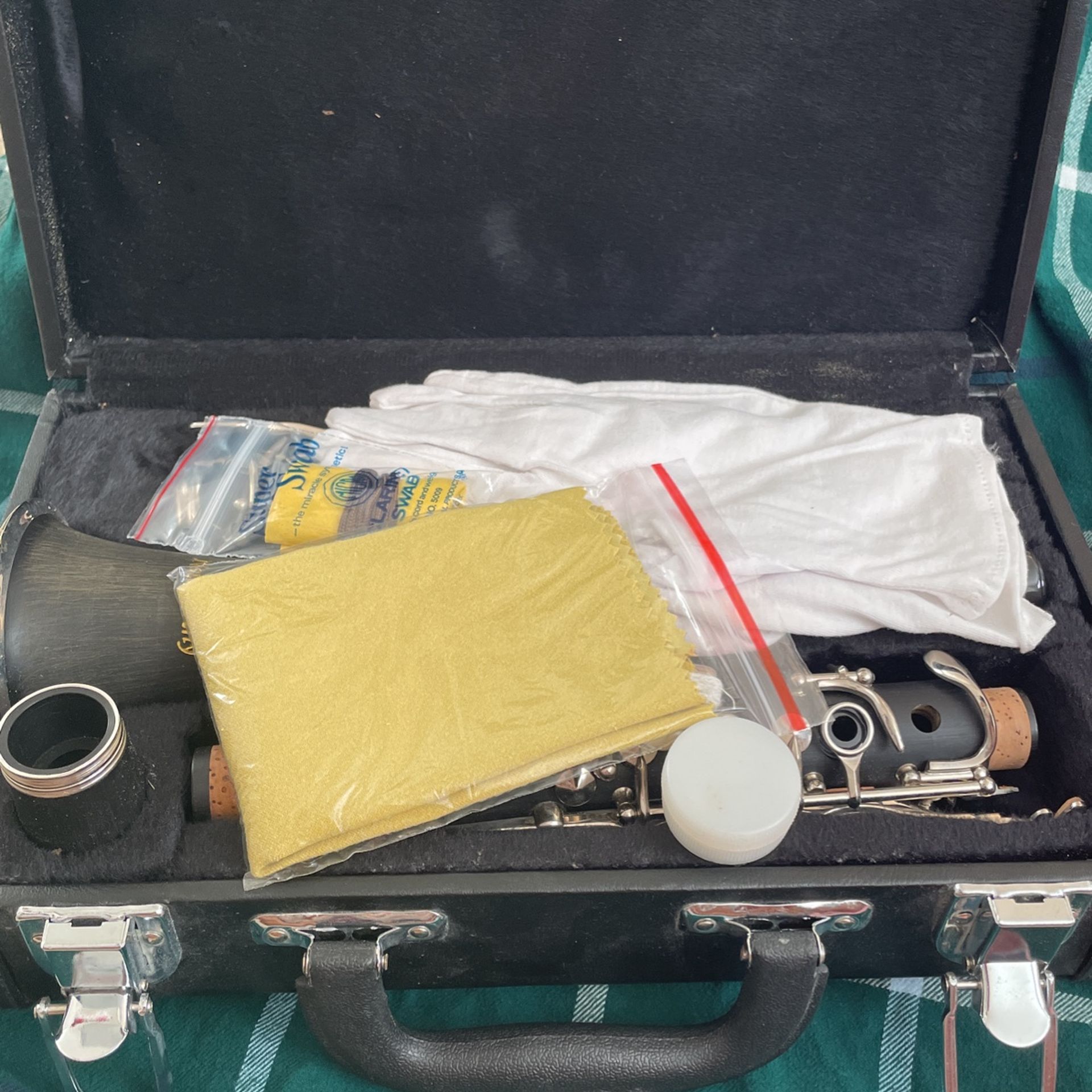 Beginner’s Clarinet. Comes with: Gloves, clarinet swab, black case (as shown in picture), all parts of the clarinet, etc.