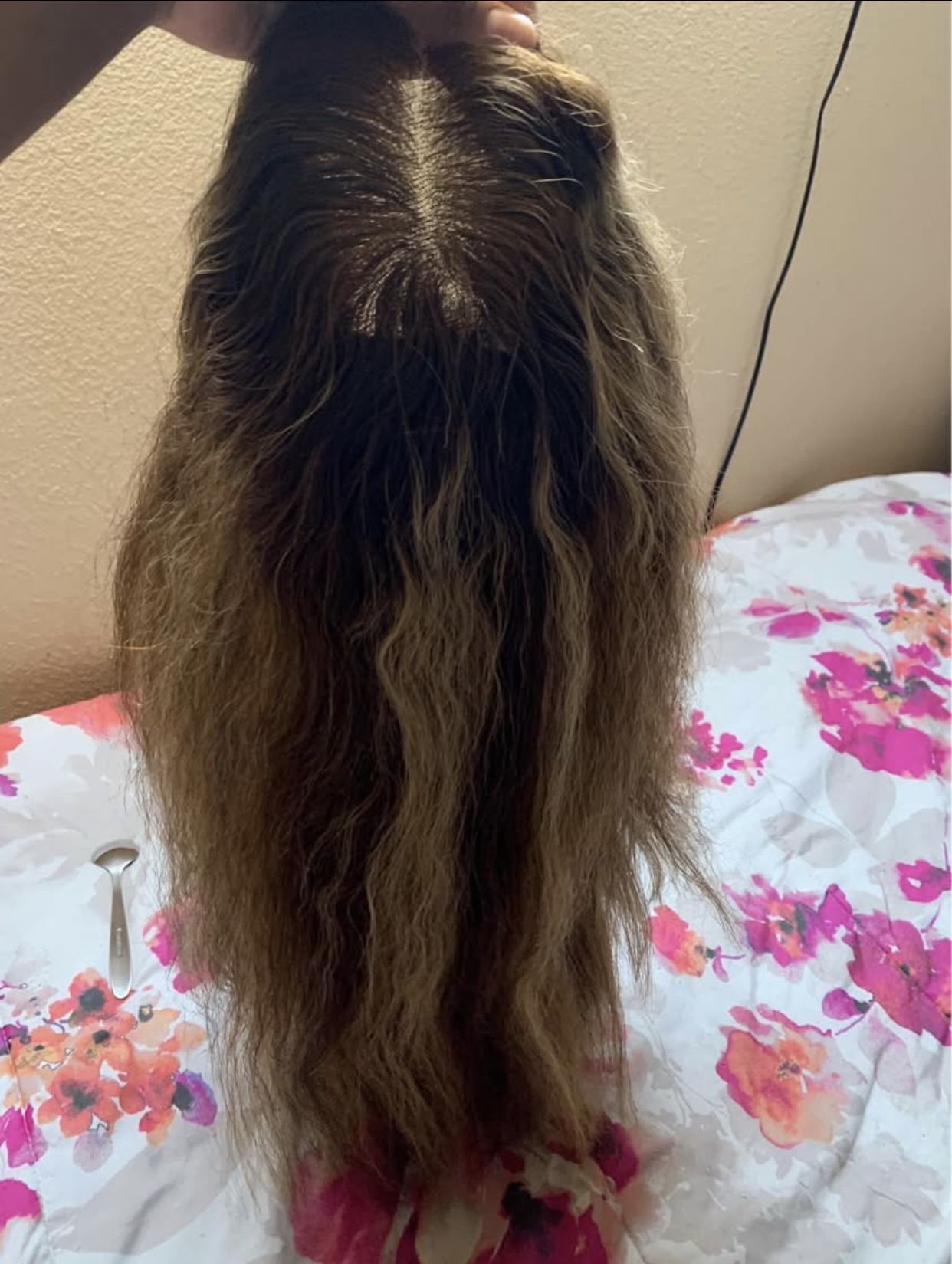 Gorgeous ombre wig with natural brown roots blending into soft honey-blonde waves. Medium-density hair with realistic parting and soft texture. Can be styled with heat on low settings. Also curls up when wet. Approx. dimensions: Length ~16–18 inches