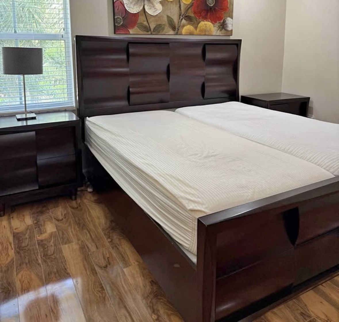 Enhance your bedroom decor with the beautiful simplicity of the Magnussen Fuqua panel bed. Featuring beautiful cathedral cherry veneers and crafted from solid hard wood, this bed is both durable and extremely luxurious. There is some very light use on the frame, barely noticeable. Set includes: bed frame + 2 night stands (NOT including the Sleep Number Mattresses) Materials: Cathedral cherry veneers, hardwood solids Finish: Black cherry Dimensions King: 56 inches high x 79 inches wide x 86 inches long Night stands: 18 inches long x 28 inches wide x 28.5 inches