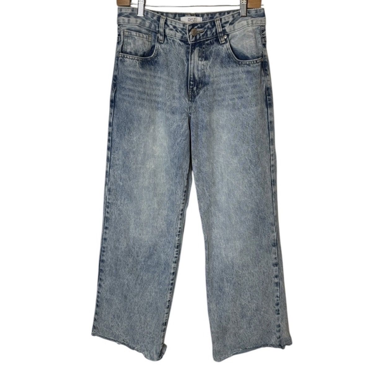 RISE SUPPLY CO Acid Wash Wide Leg Baggy Ankle Jeans Distressed size 7 Condition: Great! These denim pants feature a stylish distressed hem for a trendy look. The classic five-pocket design and zip fly with button closure offer practicality and comfort. The light blue acid wash finish provides a vintage-inspired aesthetic. Style: Wide-Leg Fabric Wash: Acid Wash Type: Jeans Accents: Distressed, Raw hem Features: Pockets, Distressed Fit: Relaxed Rise: High Fabric Type: Denim Material: Cotton Blend, Polyester Closure: Zip, Button Measurements: 15in across waist 11in rise 28.5in inseam Cash only please :) Happy to work out a bundle deal - lmk if interested!
