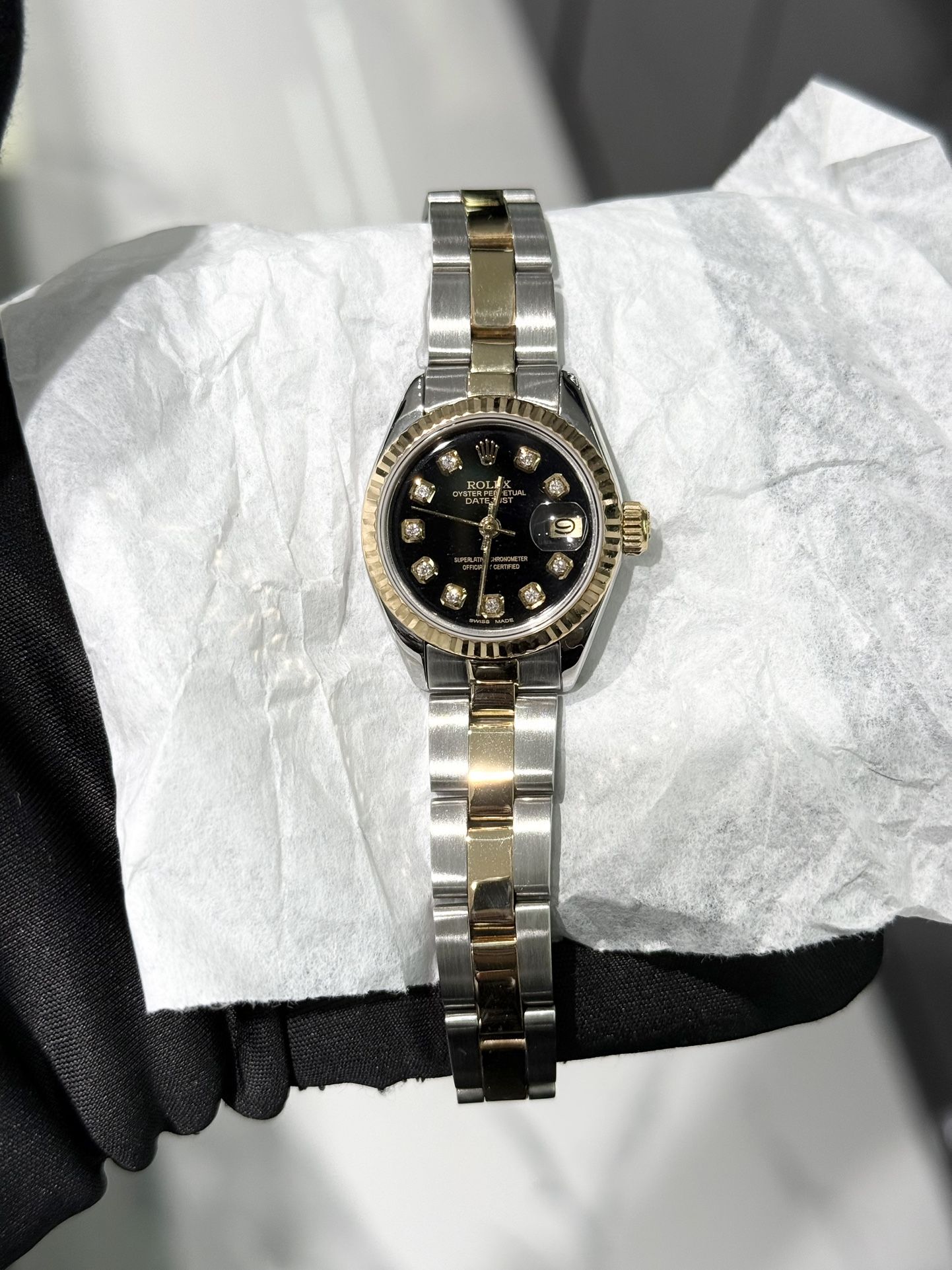 Authentic Womens 26mm Rolex Datejust Two Tone Black Diamond Dial Mint Condition Like New β Comes with Box and Appraisal Authenticity Certificate π¦π $5500 Visit the shop in Downtown LA Jewelry District By Appointment