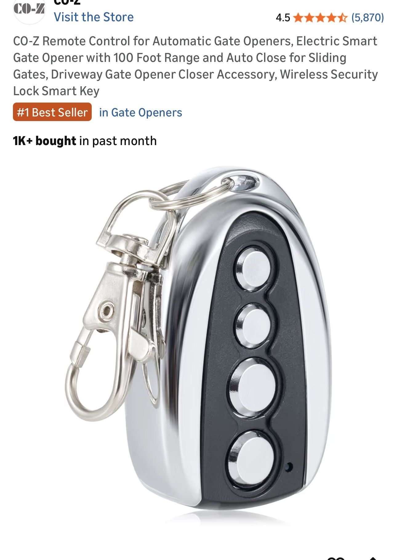 I have 2 of these remotes brand new never opened selling 2 for $8 100 FOOT RANGE: Stay nice and cozy in your car and open your gate from 100 ft. away with this convenient CO-Z remote control EASY TO PROGRAM: Quickly pair this remote with your existing gate opener system using the ANT button on your opener’s circuit board LIGHT YET DURABLE: Constructed from high quality aluminum alloy, our remote has an incredibly low weight and resists wear & tear for years of corrosion-proof use WIDE COMPATIBILITY: Open any CO-Z sliding gate or any other 433.92 MHz non-encrypted gate from up to 100 feet away with this handy remote control GREATER CONVENIENCE: Set the system to automatically close your gate 12, 24 or 36 seconds after opening it with this remote gate opener's auto close feature