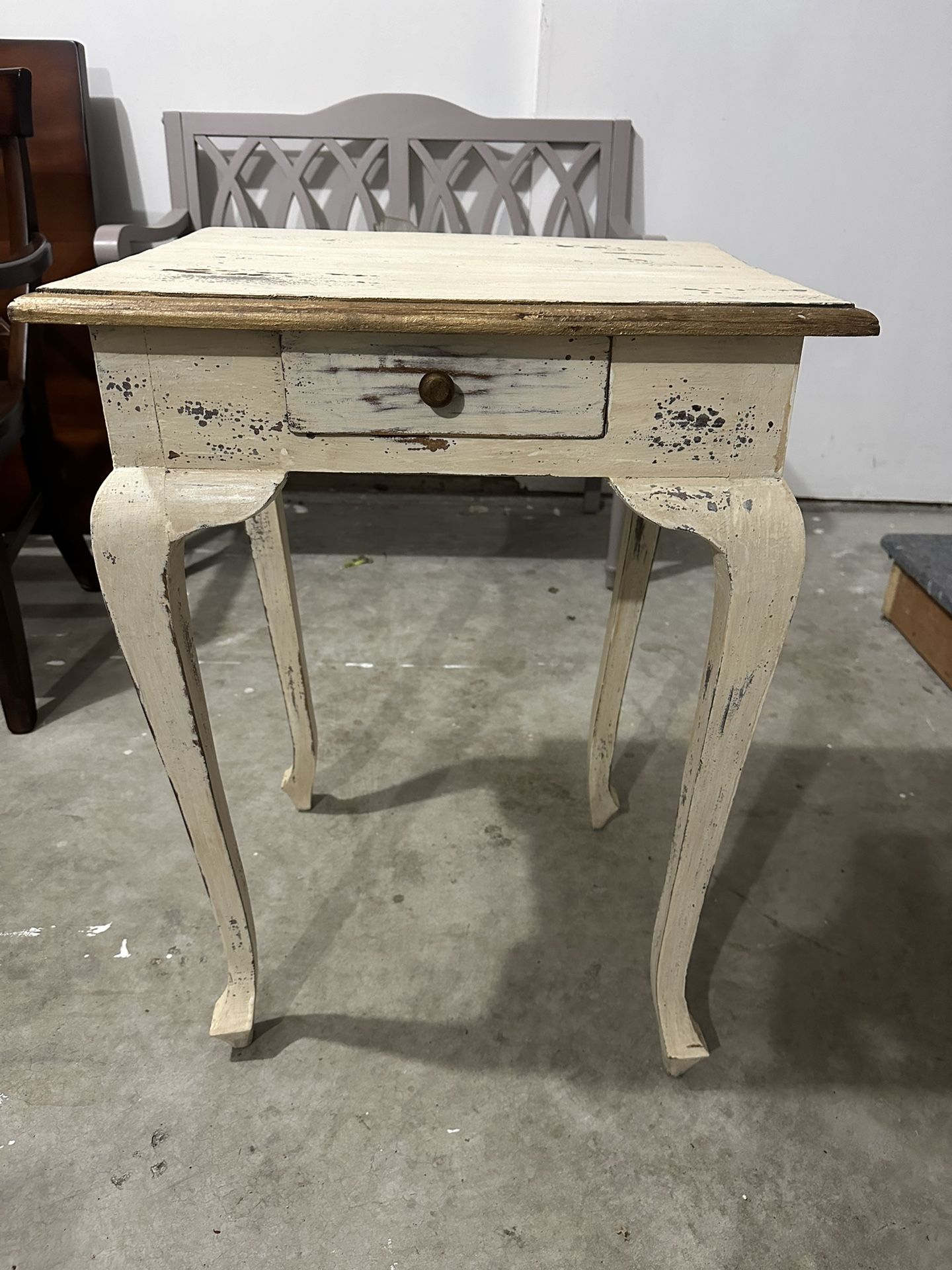 Real wood, farmhouse style table. Beige colored. Dimensions - 30.5” tall, 17” deep, 21.5” wide. Pick up in Puyallup by Tacoma Boys.