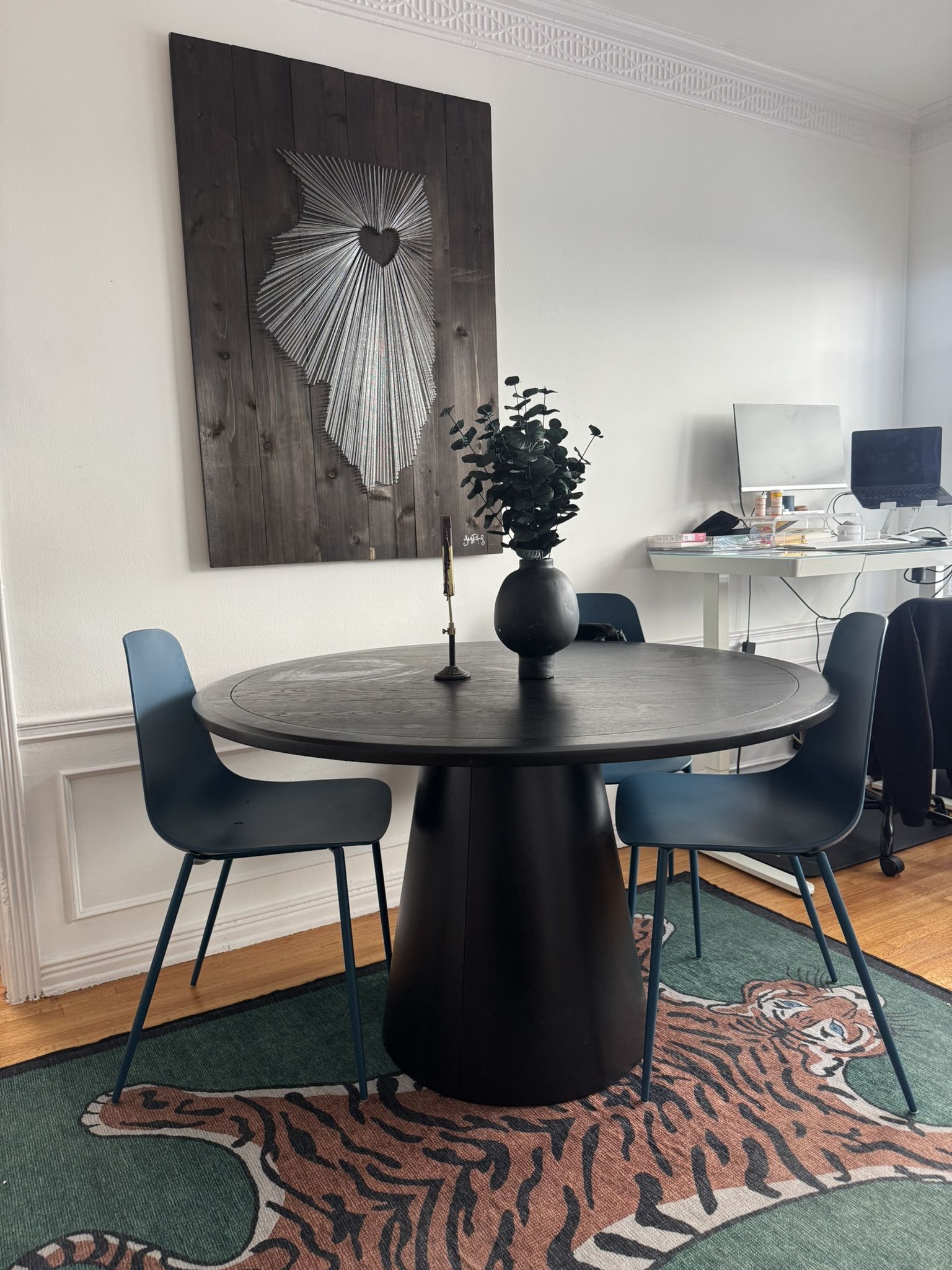 Beautiful black table. Seats 6. Less than a year old, minor imperfections. Got it from living spaces. Closest dimensions in 2nd photo. Will need to be picked up, very heavy. Price is obo.