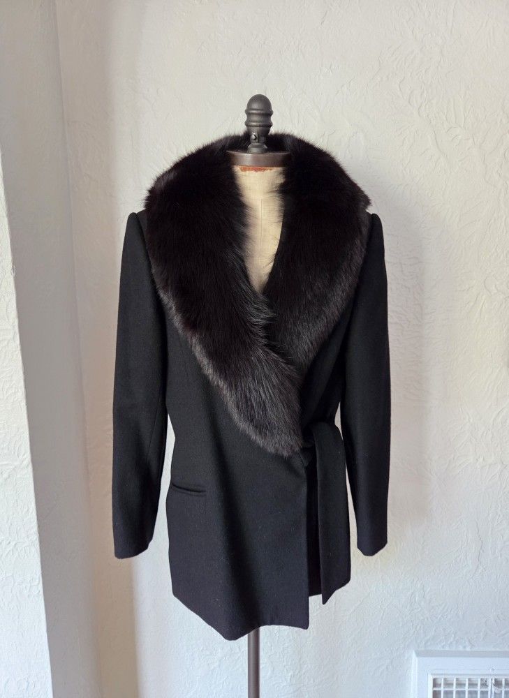 Black Fox Fur Collar Coat Wool Side Tie Jacket NO OFFERS
