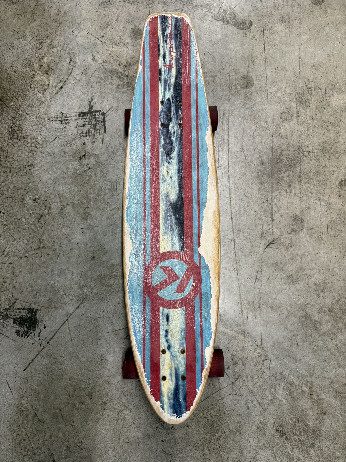 Kryptonics longboard cruiser skateboard approximately 34 inches long. Solid trucks and smooth rolling wheels. Great for cruising, beginners, or casual riding. Shows normal wear from use as seen in photos but rides well. Pickup in Dania Beach.