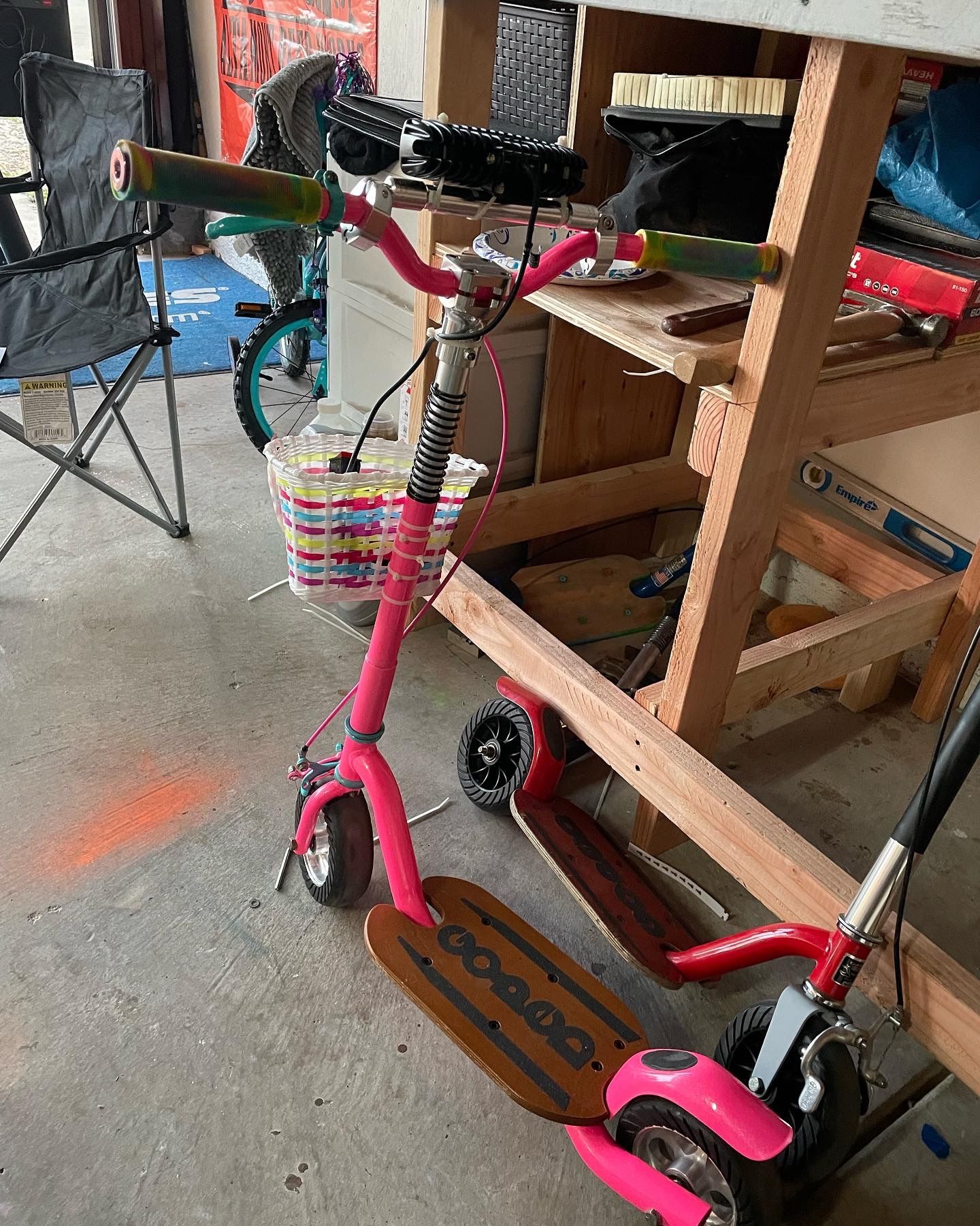 Pink is grow Ped, custom powder coat with flake, dirt jumper handle bars, custom paint, and custom aluminum wheels. Other blue one is just know Ped, custom grip tape, wheels and grips. We don’t really ride them much. Built pink for my daughter. Could be cool set for dad and daughter. 400. Wheels alone are worth 300. Cash only