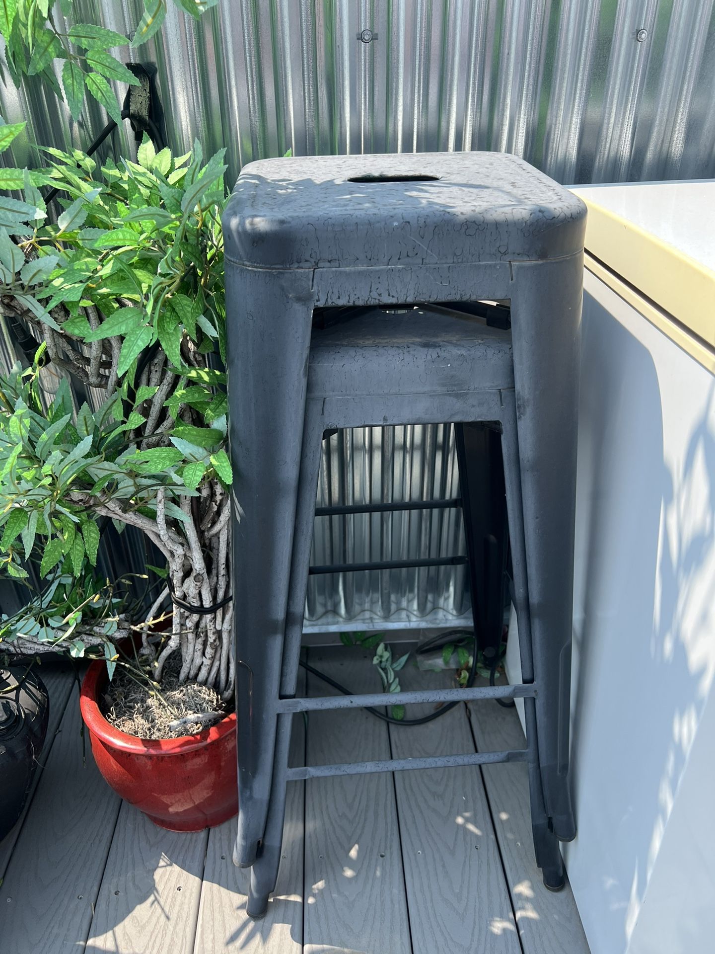 Selling 4 black metal bar-height stools — classic industrial Tolix-style design. Super sturdy and stackable. Great for patios, kitchen counters, outdoor bars, or shops. They’ve got some natural weathering from being on a rooftop patio, but structurally they’re in great shape. Still very solid and usable. Height: Bar stool height (about 30”) Material: Powder-coated steel Condition: Fully functional, just cosmetic wear from outdoor use Price: $80 for all 4 Pickup in Denver, Tennyson st Message me if interested.