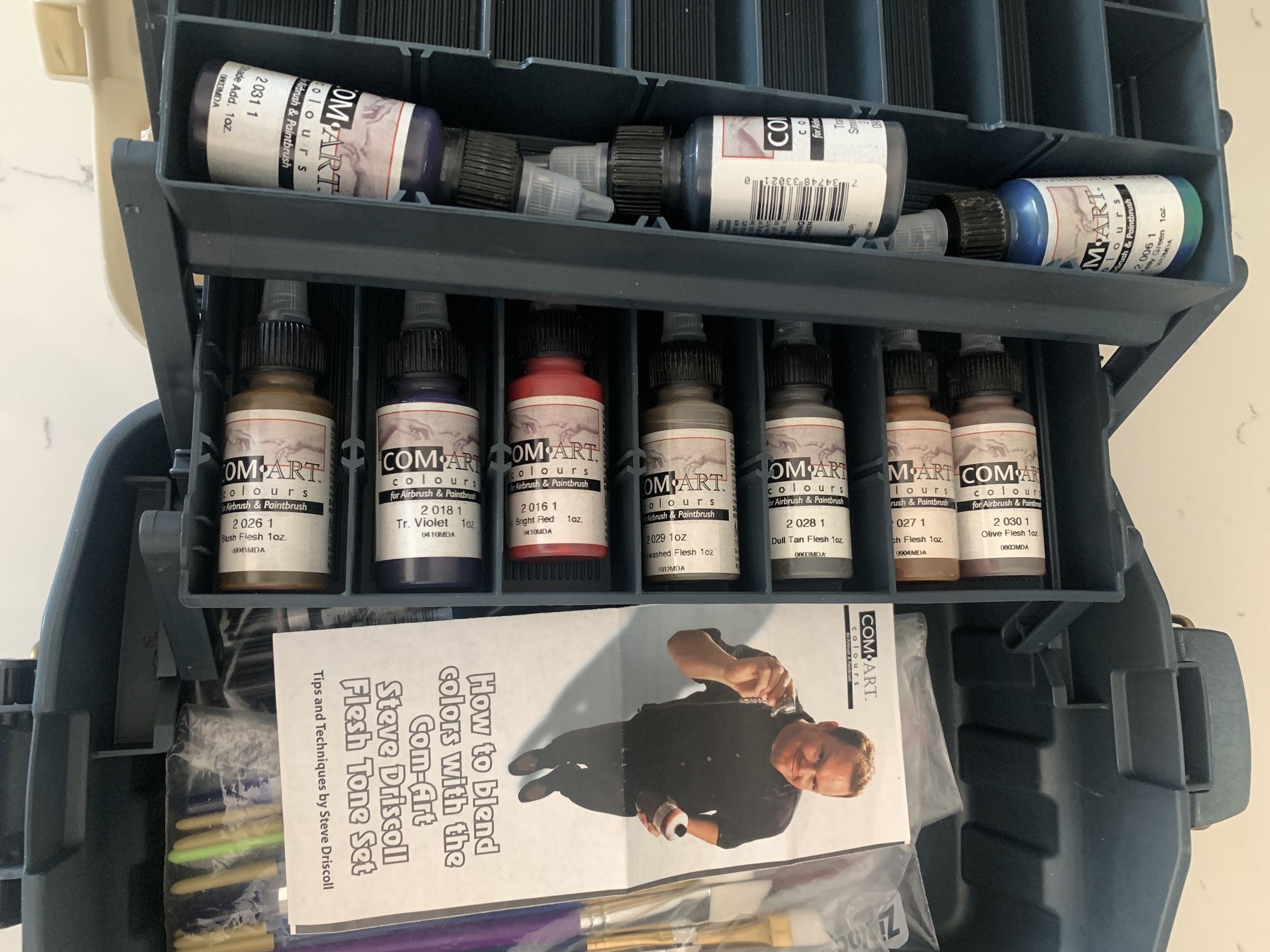 This group of art supplies comes in a pre-owned Plano tackle/storage box in very good condition Tackle box also has original divider spacers if you choose to use them Included are: 10 new bottles of Com-art acrylic paints with pamphlet on how to blend colors 16 Long handle brushes 11 short handle brushes All brushes are new 1 new large artist's mixing palette 1 new foldable artist's palette Located in Green Valley, Las Vegas Public Meetup Thank you