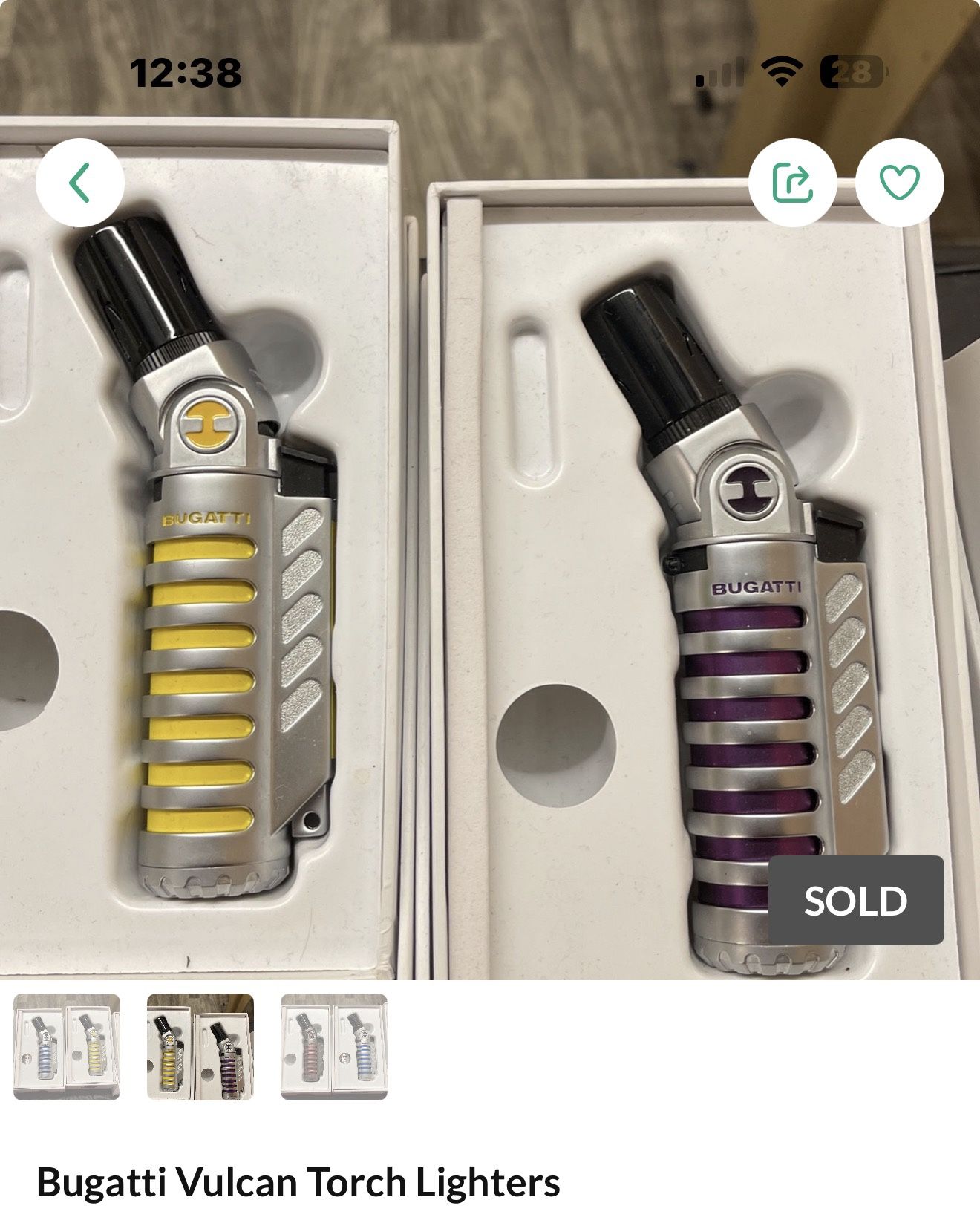 Bugatti Vulcan dual torch lighters Brand new never used retail for $ 100 in the stores On special for 45.00 here and other colors available Red wine / matte gun, juniper green /matte gun, purple/matte gun, polished racing yellow/matte gun