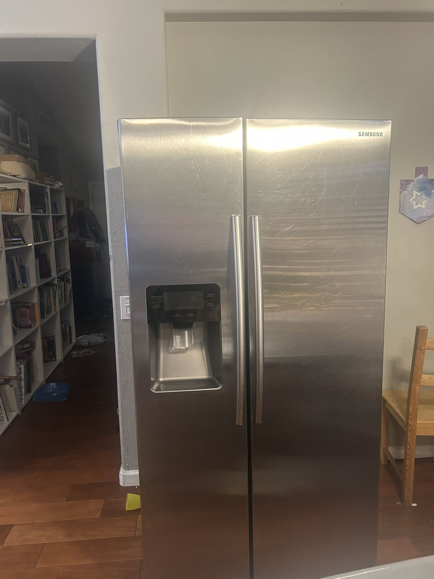 Cold and clean! No smells! Ice and water work. Some cracks on bins, scratches on shelves. Some scratches & small dents on front, otherwise in excellent condition. I cleaned it myself, had it for 5 years. Not a retail shop. Must pick up.