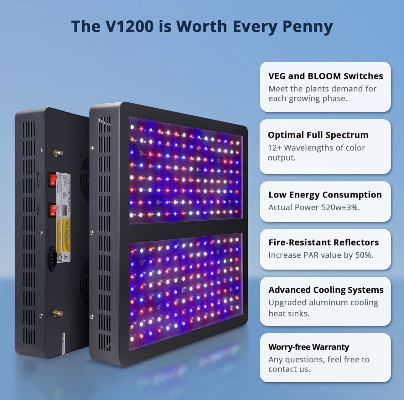 $220 for 1 or $375 for both. 【Optimal Spectrum】The secret to VIPARSPECTRA’s success is optimal full spectrum lighting which provides plants in all stages from veg to flower with everything they need in the natural sunlight. This results in bigger buds and higher yield all while saving you on energy costs.VIPARSPECTRA is a trusted brand in the lighting industry by providing the best customer care with quality and safe products. 【Outstanding Design】Sturdy durable construction with fire-resistant iron housing. VEG and BLOOM switches are suitable for each growing phase. Upgraded aluminum cooling heat sinks and advanced high speed quiet fans are great for heat dissipation. 【VEG & BLOOM Double Channel】The VEG channel includes mainly blue and white LED, which is needed for germinating seedlings and promoting early vegetation cycle. The BLOOM channel provides more red wavelengths which is important for plants in the flowering and fruiting stage. VEG and BLOOM switches can be used together to obtain maximum growth performance throughout the seedling and flowering stage of your plant cycle. The light can replace a traditional 800W HPS/MH lamp while consuming only 520W. 【Coverage area & Hanging height】The light is perfect for a 4.5’x4.5’ vegetative coverage at 32”and 3.5’x3.5’ flowering coverage at 24”. We recommend hanging the light at 32"-44" and running the lights 18 hours per day during the vegetation stage. During the flowering and fruiting stage, hang the light at 24"-28" while running 12 hours per day with both VEG and BLOOM switches. Remember to properly adjust the height of your light accordingly to your plant desired level for optimal growth.
