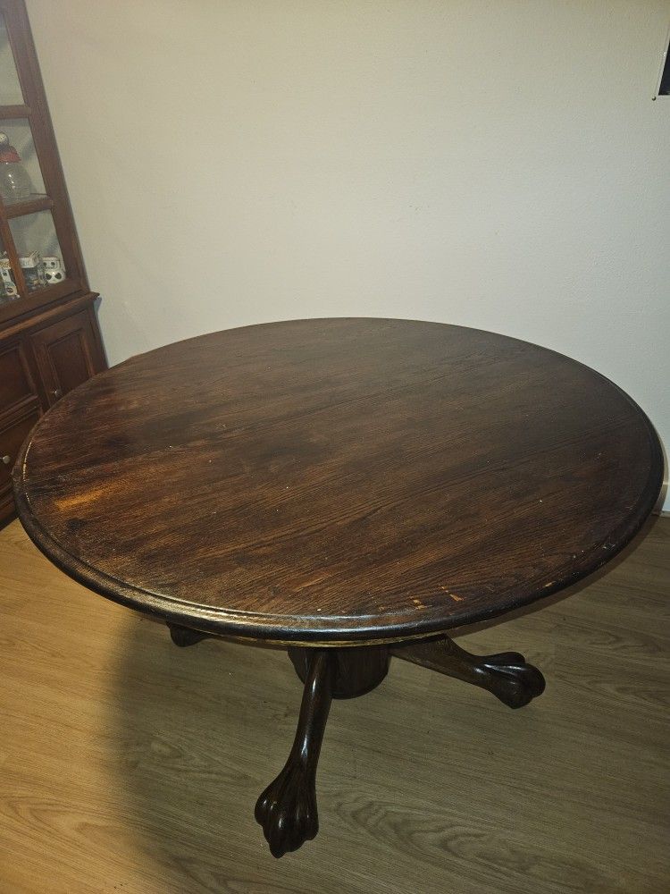 Solid wood dining room table +4 mismatched chairs Table measurements: 48 inches wide, 31 inches tall Minor scratches from previous owner and missing leaflet. I've refinished and polished it a couple times over the years. Must pickup