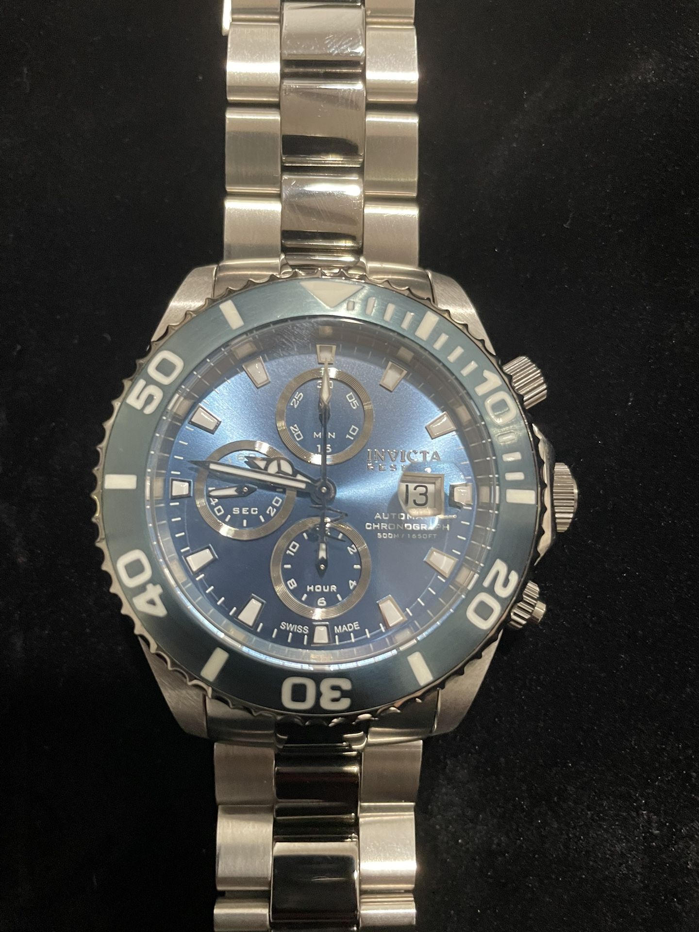 Invicta swiss automatic pro diver chronograph watch with ice blue dial and bezel. Rare & expensive for Invicta because it has the Swiss Caliber 7750 automatic chronograph movement. Excellent condition Stainless steel with polished and gunmetal finish Ice Blue dial and bezel Automatic movement: Swiss Caliber 7750 Water resistance 500 m Case size 47 mm Band size 24 mm Does not come with box or papers