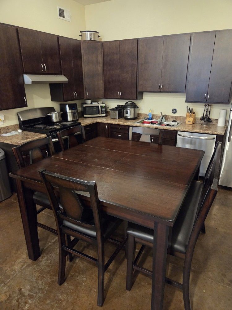 High-top dining table and 4 matching chairs and 1 bench I purchased from Weekends Only a few years ago. Table includes a fold-in leaf that allows you to adjust the size depending on your space. Chairs have padded seats and are very sturdy. Condition is good with normal use and some blemishes. Sterdy and firm with no wobble. Perfect for apartments, homes, or dining/kitchen areas.