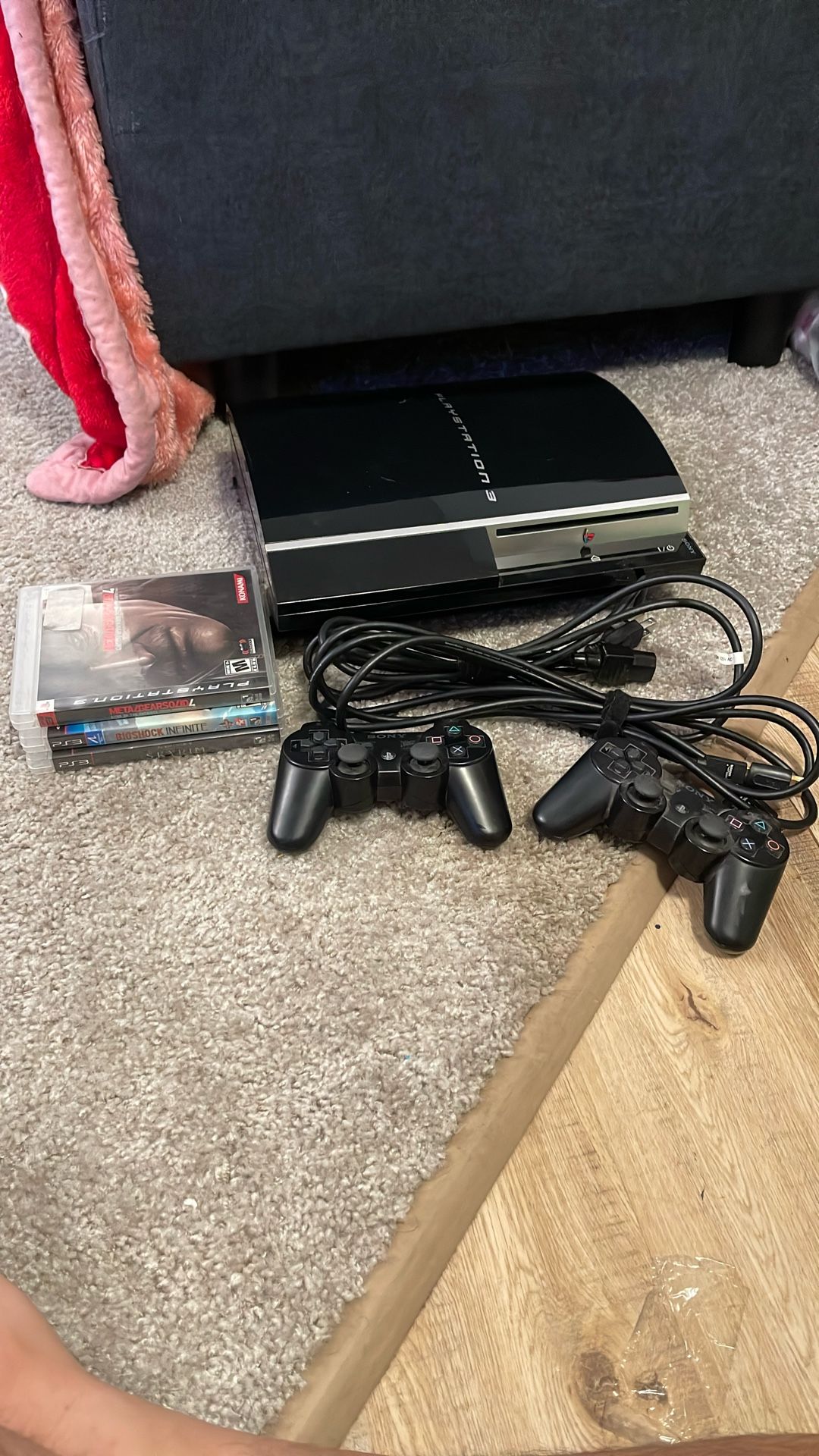 PS3 is tested and powers up. Controllers, using third party cords, don’t charge for some reason? Would be the cords idk but either way I’ve included those cords for whoever wants to mess around with it. Games: Metal Gear Soid 4: Guns of the patriots Boston’s Infinite The Elder Scrolls V Skyrim (Elder Scrolls 5)
