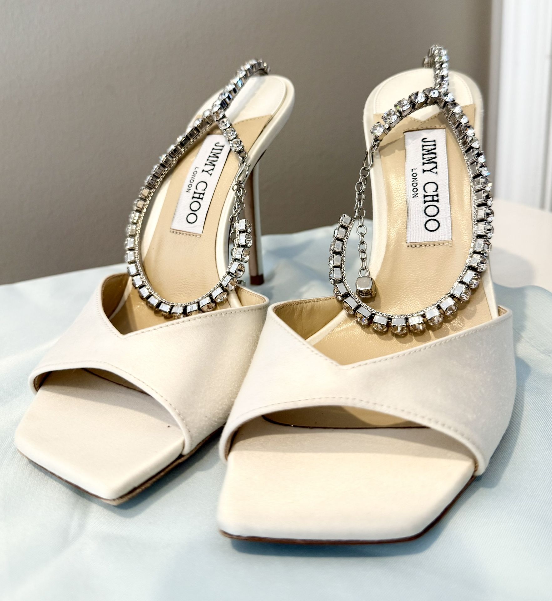 Chic ivory satin heels with sparkling ankle straps. Ideal for elegant events. Worn once, professionally cleaned. Elegant ivory satin with crystal embellishments—perfect for weddings or special occasions. 💎 Size 40 EU 💰 $599