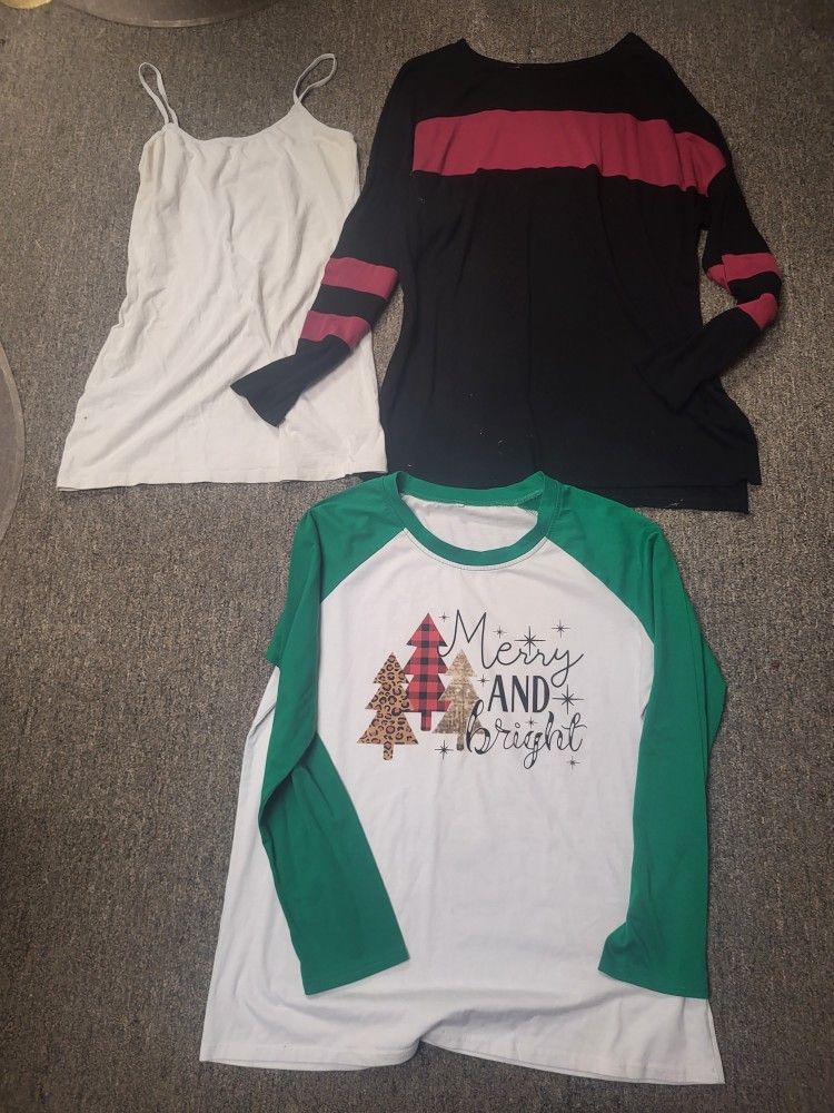 Jr/Women XL Merry and Bright holiday cheer jersey and Active Wear white cami. black/maroon stripe long sleeve items 3. Lot 03 Pick up 5 miles west of Janesville Can meet westside or southside Janesville
