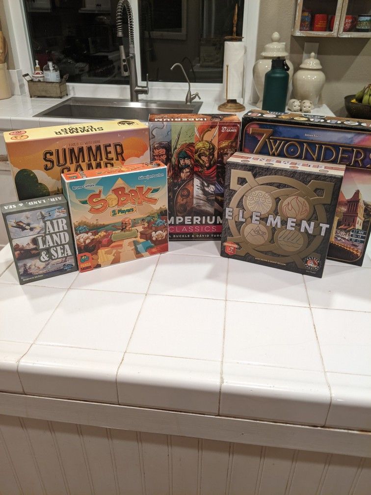 Here are the games I have for sale: -7 Wonders (Box is pretty worn, but all components are in good shape). $20.00 - Summer camp (Like new). $10.00 - Air, Land, and Sea (Like new). $7.00 - Element (Like new). $15.00 - Sobek (Like new). $12.00