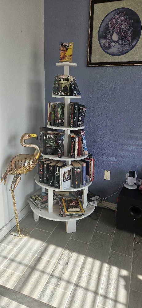 Beautiful and very steady bookshelf. It looks beautiful π It can also be used as a Christmas village display. It's 5 feet tall, the biggest circle cincunference is 2.3 feet, and the smallest circle is 7.5 inches. I am asking $100 firm