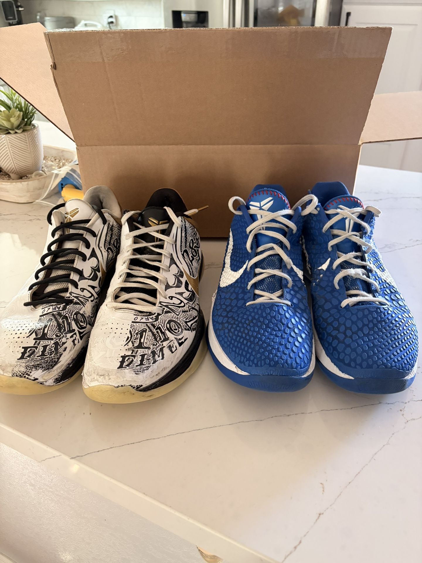 Kobe 6 Protro “Dodger” And Kobe 5 Protro “Big Stage” Both Size 13, Both Come With Original Box, Both Are 100% Authentic. I have another pair of mismatch Kobe 8’s I am selling for $50 as well. All pairs are used but in considerably great condition. If you have any questions, offers, or trades for another pair of Kobe’s in a 13-13.5 please let me know!!