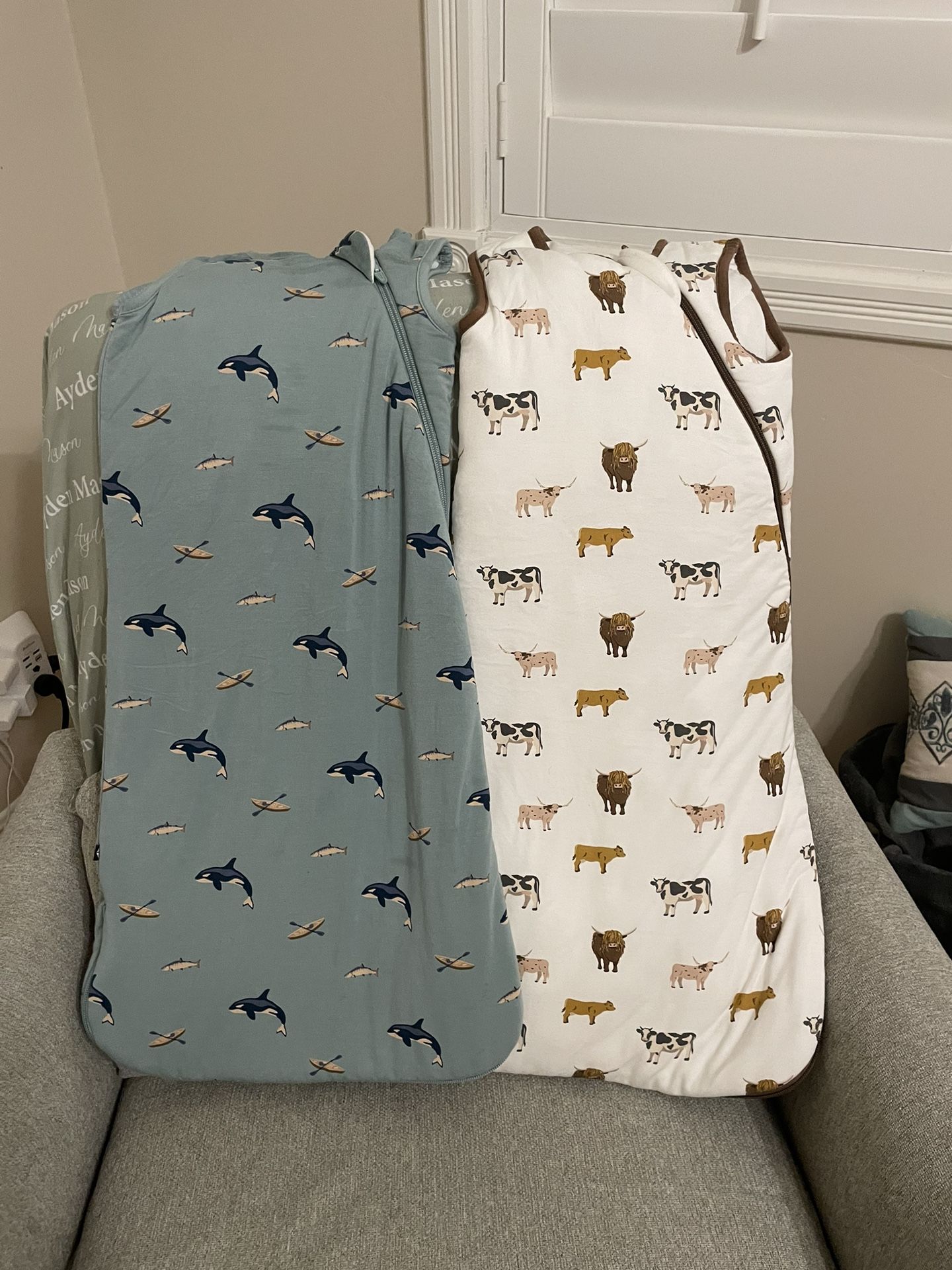 Kyte sleep bags - both size small Farm animal (white) - tog 2.5 Ocean animal (blue) - tog 1.0 Like new, used only twice and outgrew! $40 each or both for $70