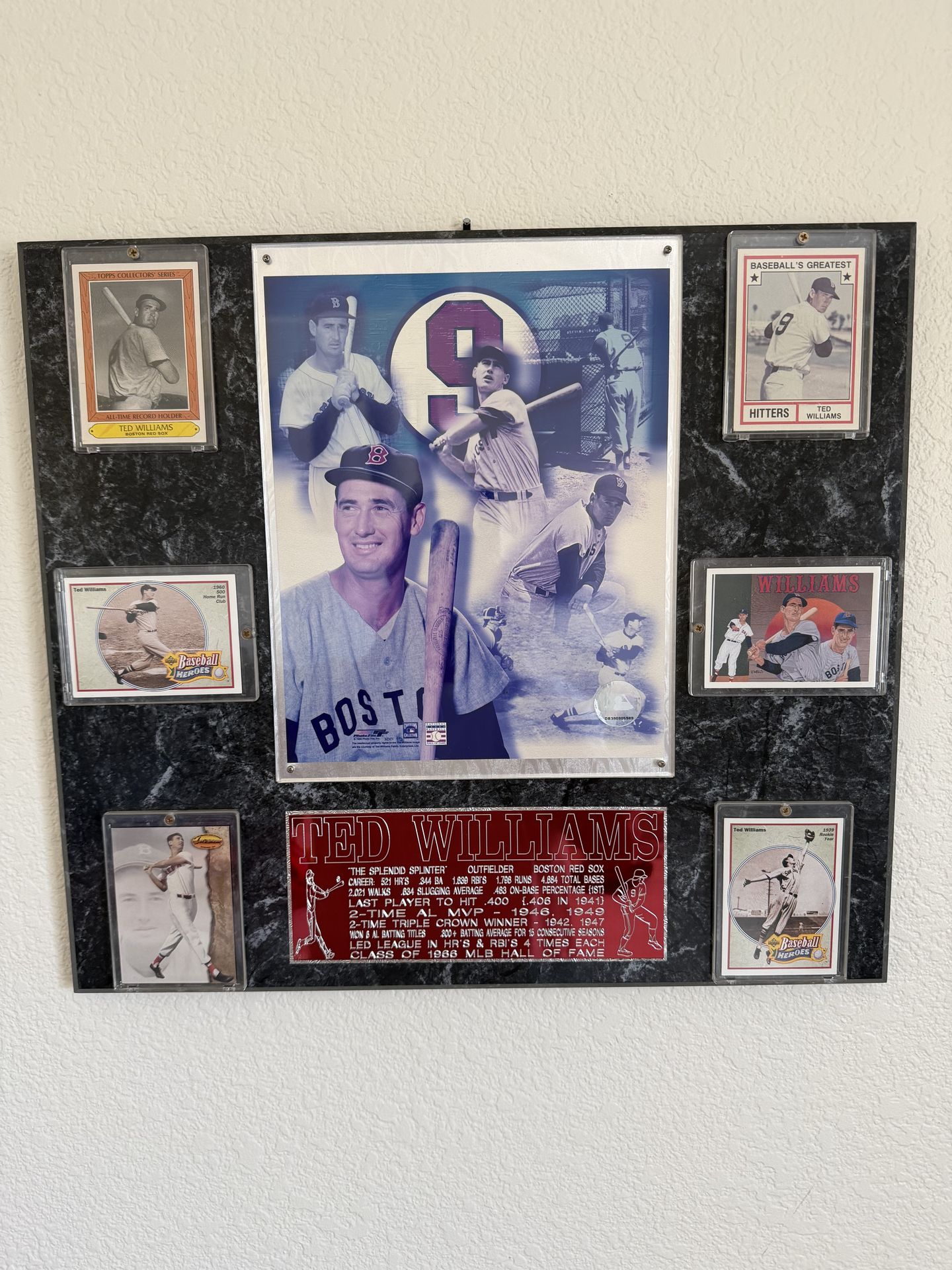 This is a beautiful collector item of Ted Williams. It is a collage of cards with Ted Williams photo and accomplishment beautifully displayed to be hung and admired by sports fans. Large frame . One of the greats of all times . would look great in any room or collection. Awesome price for $75 OBO