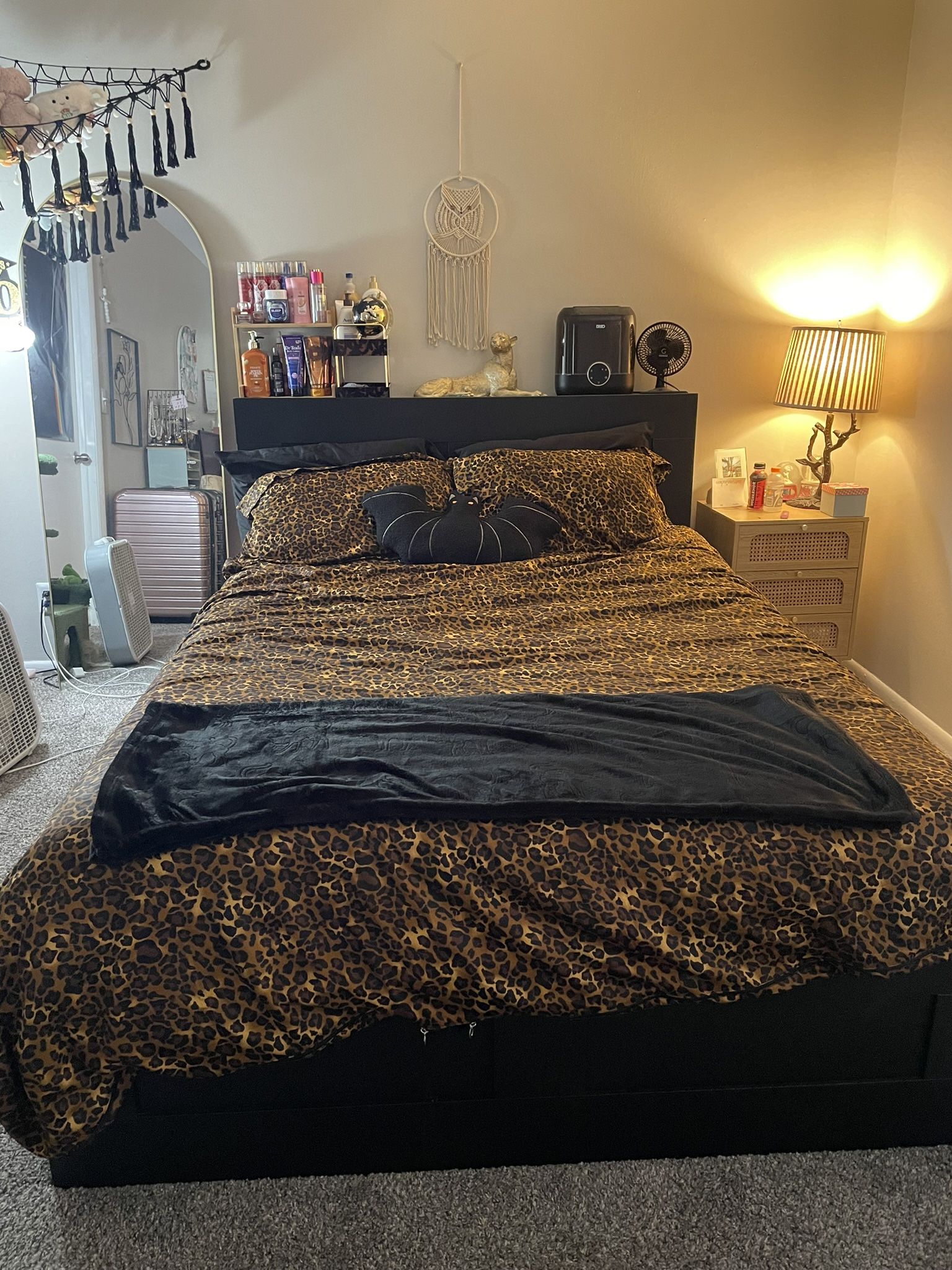 Newley used black bed frame, dusty but in very good shape. From IKEA. Has 4 big drawers and 4 side shelves for storage. Ready for a new bed and need to get rid of asap!