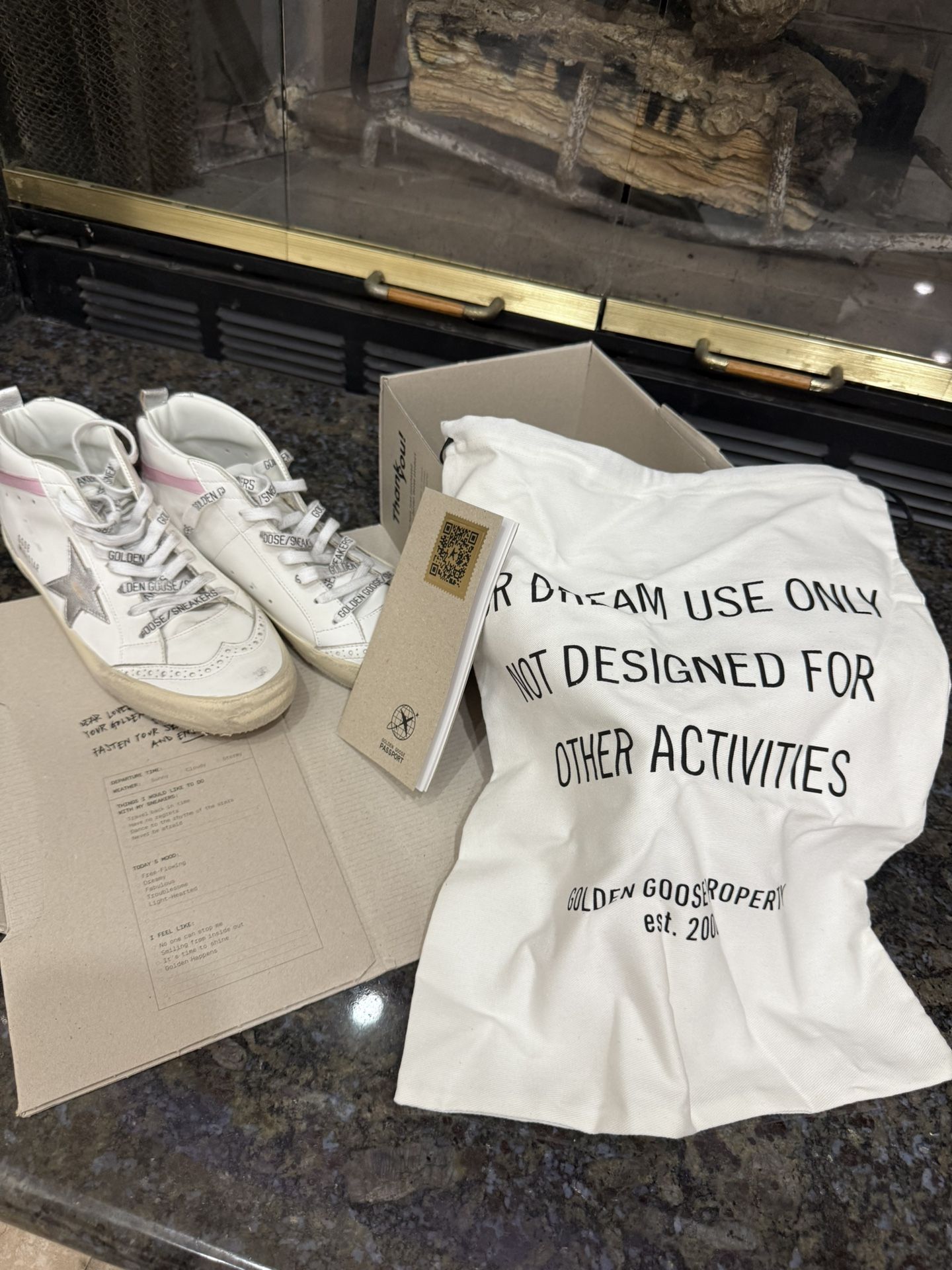 Brand new, never worn Golden Goose Mid Star sneakers — authentic and made in Italy. Beautiful white leather with silver glitter star and light pink heel stripe, featuring the signature distressed sole and GGDB logo details. Comes with original box, dust bag, and tags. Size EU 39 (US 8.5-9). Classic and hard-to-find colorway that adds a chic touch to any outfit. 100% Authentic | Ships fast and safely packaged