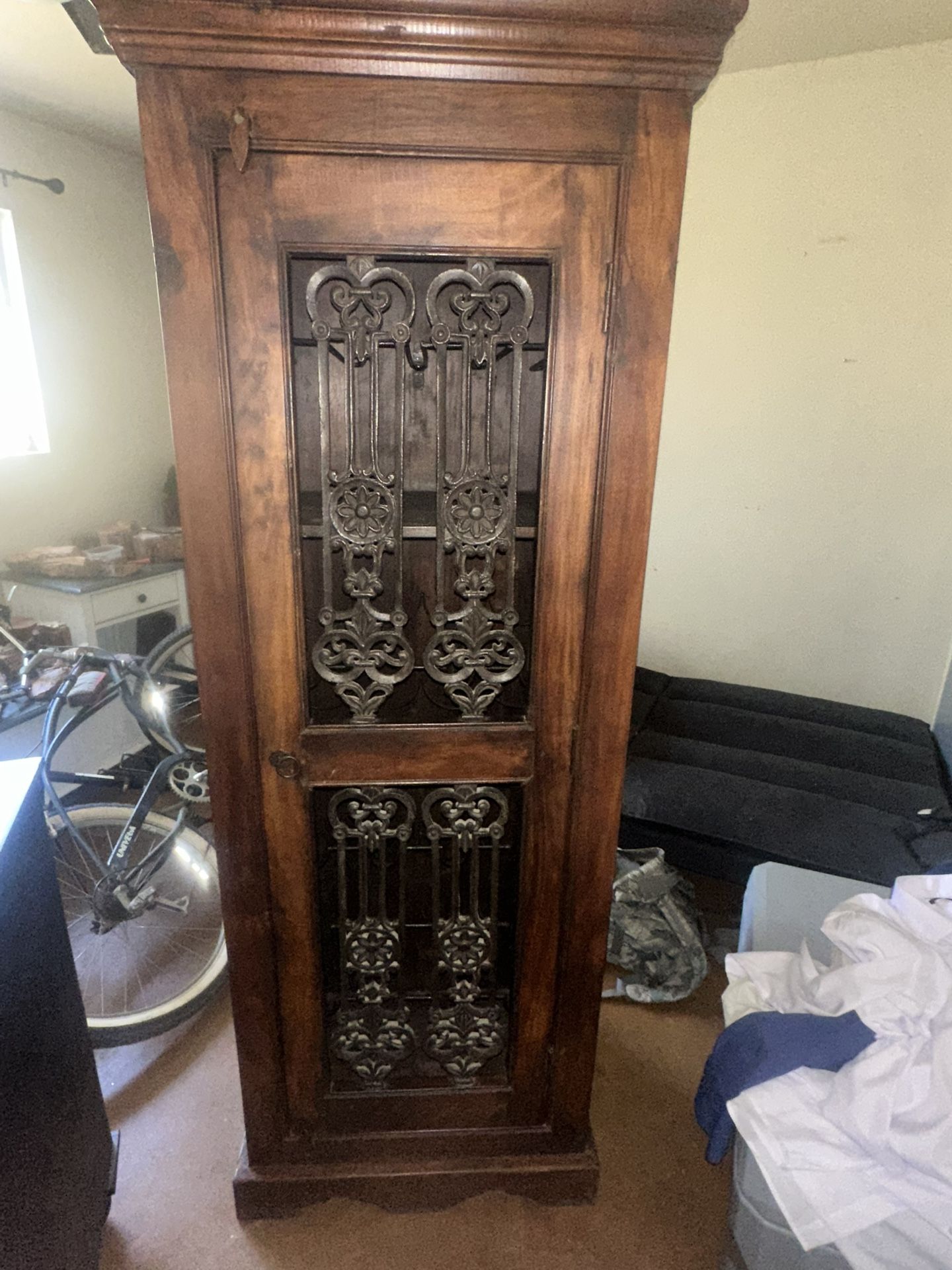 Are you crazy about wine? Are you looking for a conversation piece to store your wine in. Then this is the piece for you. It’s about 7 feet tall Has a shelf up top Holds wine glasses Holds 20 bottles of wine Hard wood Handmade Imported from Indonesia Bring blankets and a regular dolly not the 4 wheeler ones