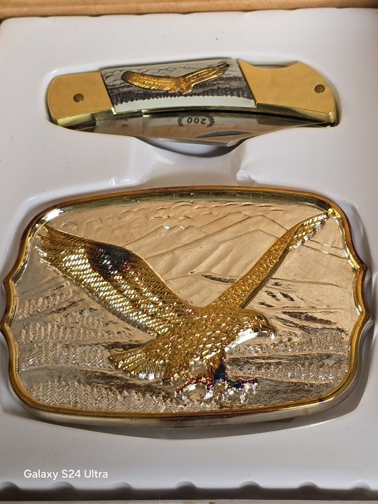 CLASSIC BELT BUCKLE AND POCKET KNIFE FLYING EAGLE OUTDOOR WILDERNESS FOREST SILVER/GOLD TONE.
