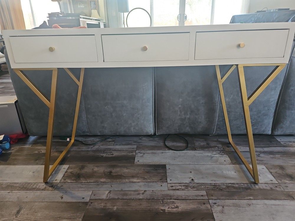 The material, looks like the wood was wrapped with a white leather-like material. Has 3 drawers, In good used condition. Price negotiable.